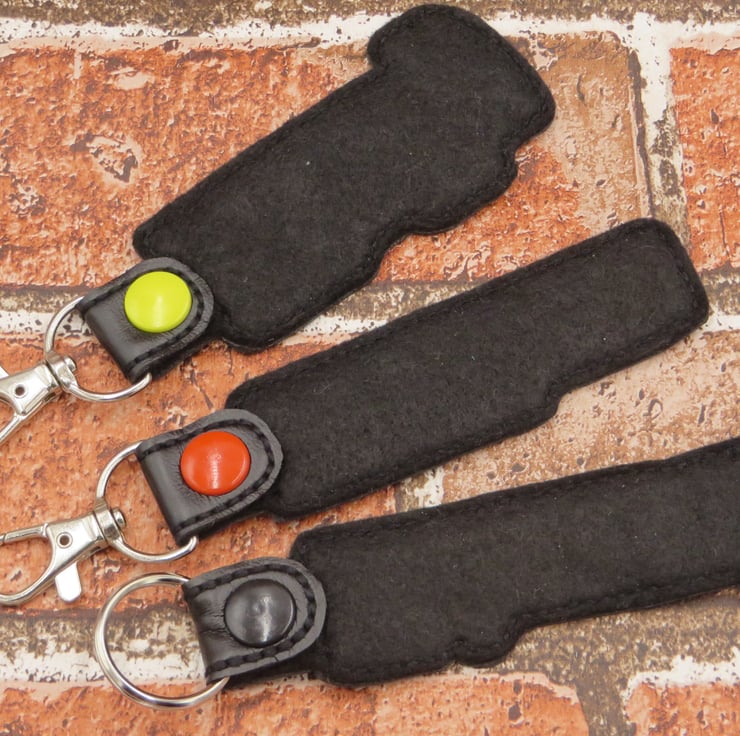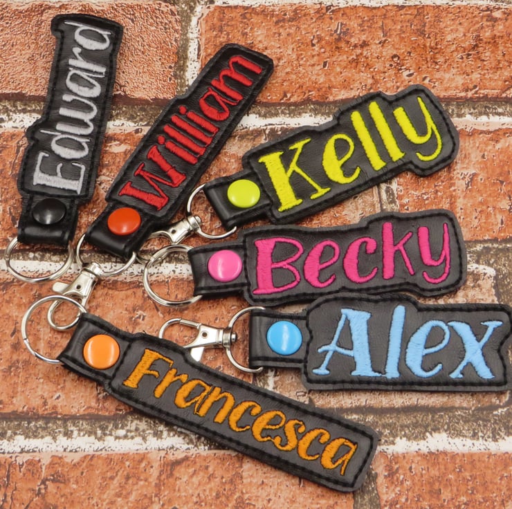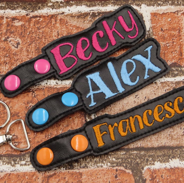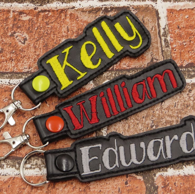 This keyring is custom made especially for you or to give as a personalised gift. The keyring is made using black vinyl with soft black felt backing and the name is machine embroidered in colourful threads to your specifications.