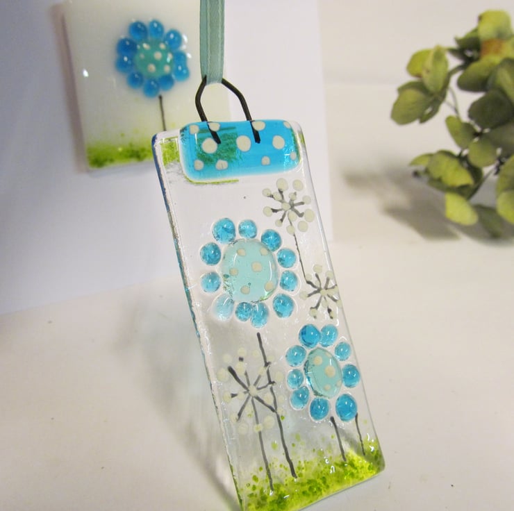 This pretty little hand made set is perfect as a quick, yet hand made, birthday or other special occasion gift, the set has a blank greetings card with a fused glass panel and a matching mini suncatcher in our new Country Meadow design.