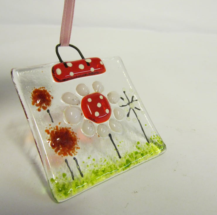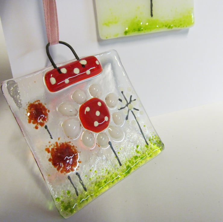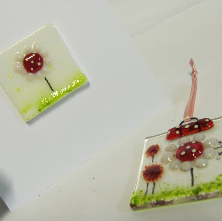 This pretty little hand made set is the perfect last minute gift for a birthday, forgotten birthday, thank you or get well card. It consists of a blank greetings card with a fused glass panel fixed to the front and a matching mini suncatcher, both in our new Country Meadow design.