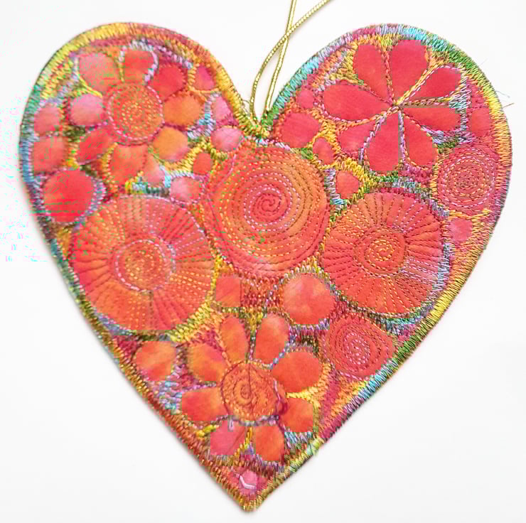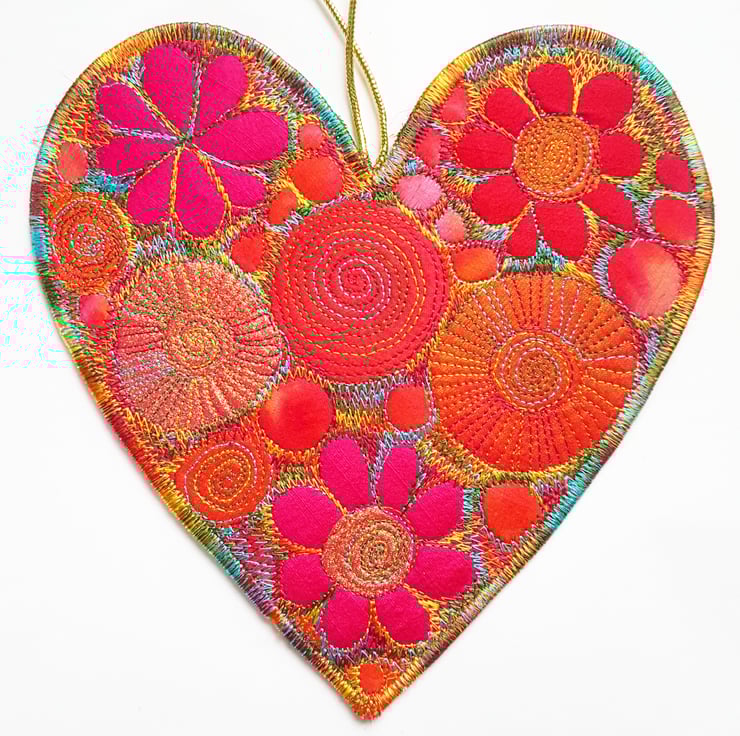 This is a handmade machine stitched fabric heart hanging decoration.