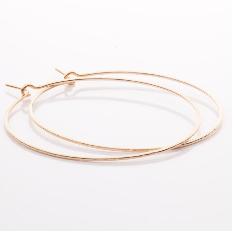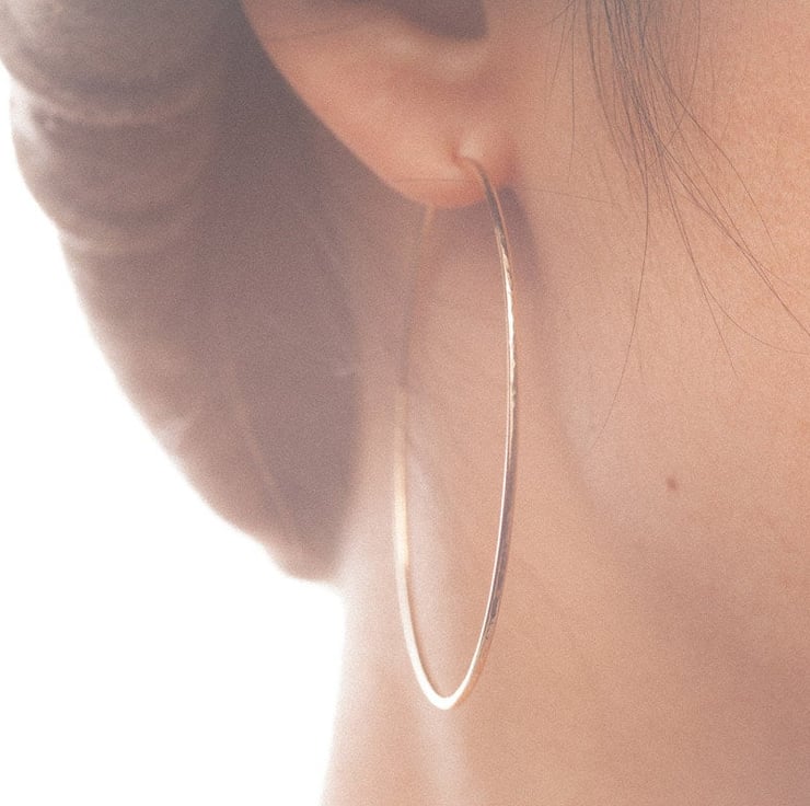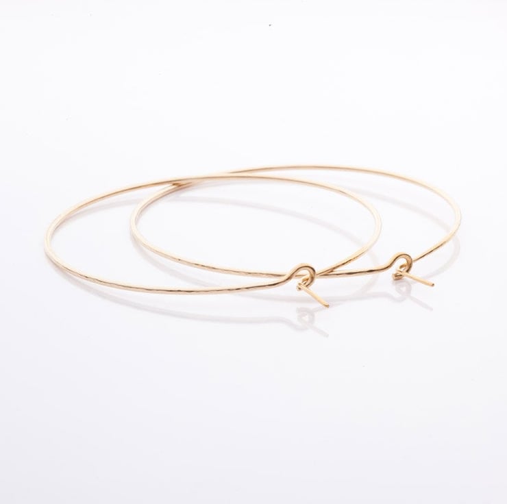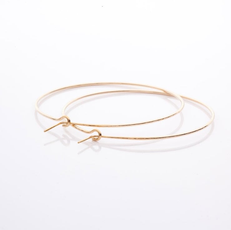 Handmade Gold Filled Large Hoop Earrings are made from 16 gauge (1.30 mm) 14K Gold Filled Wire, hand forged and hand textured to approximately 58mm (2 1/4 inches) diameter. For the ear posts, they are hand filed to 20 gauge (0.8mm) for a comfortable fit. The Earrings have been tumbled for strengthening and a polished, smooth finish.