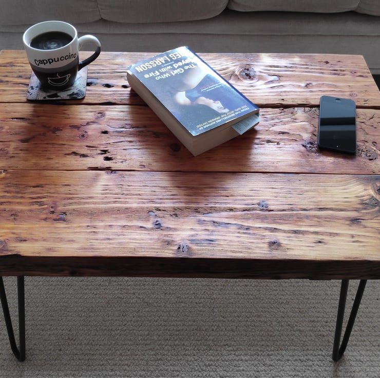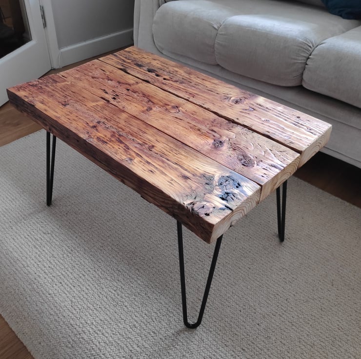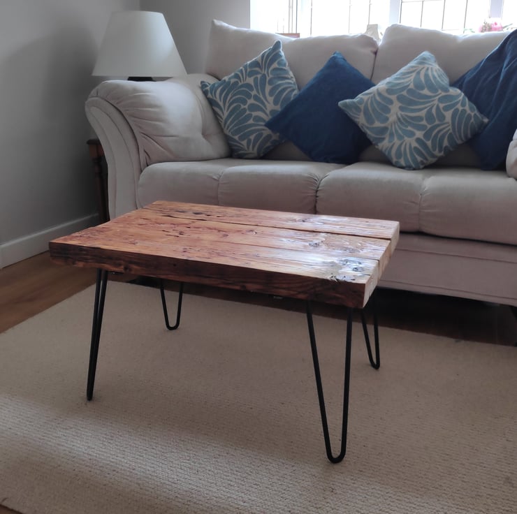 This original coffee table is handmade from reclaimed oak sleepers with fitted steel hairpin legs and is perfect for adding a touch of industrial-chic to any living room or dining room.