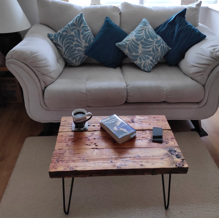 We rescued some unwanted oak sleepers from an old garden feature and instantly fell in love with the wood. I could see it would make a beautiful tabletop and so sanded it down, cut it to size, joined it together and oiled it, before pairing it with the hairpin legs.