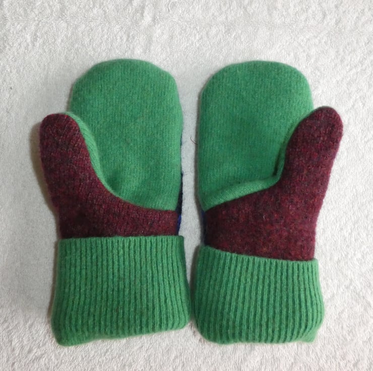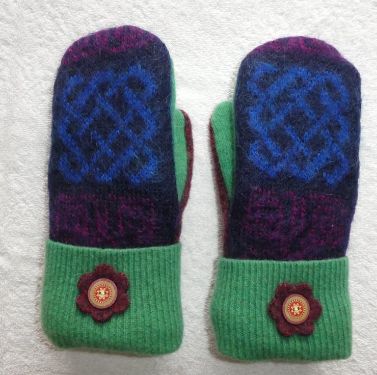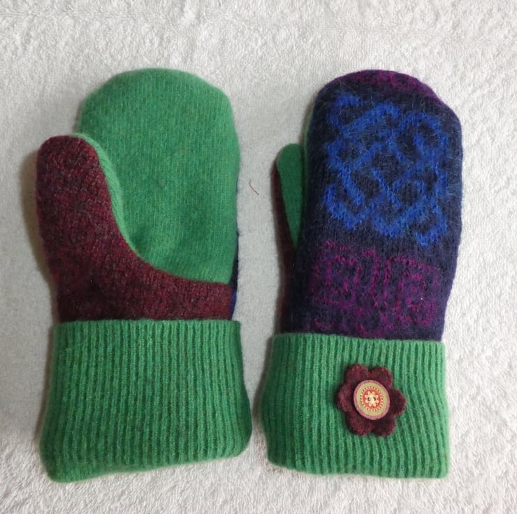 These warm and cosy winter mittens have been re-fashioned from up-cycled wool and mohair sweaters. The jumpers have been washed and felted before stitching. A full lining for the mittens has been made from polyester polar fleece for warmth and comfort. A decorative felt flower with button center has been stitched to the cuff of the mittens.