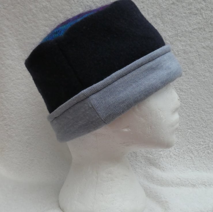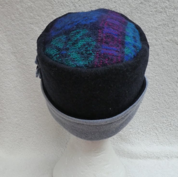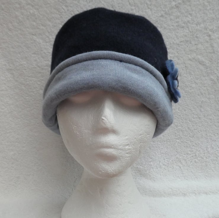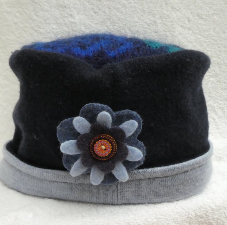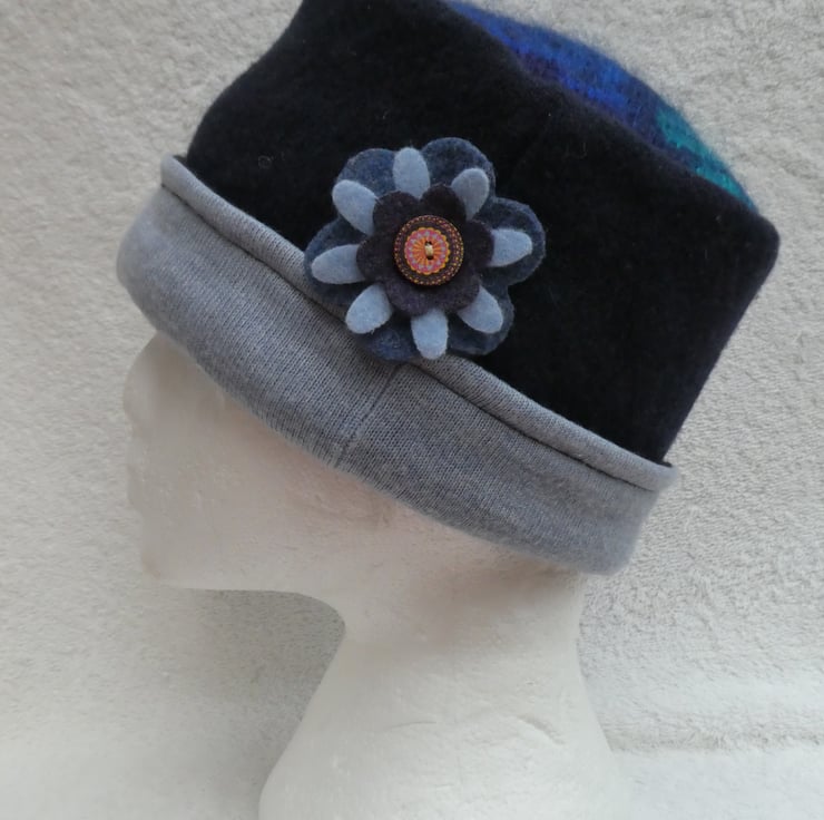 This stylish hat has been re-fashioned from up-cycled wool sweaters. The jumpers have been washed and felted before stitching. A full lining for the hat has been made from a colour coordinated acrylic sweater for warmth and comfort. The brim folds up to show the contrast lining. A decorative felt flower with button center has been pinned to the brim of the hat with a safety locking clasp, so is removable.