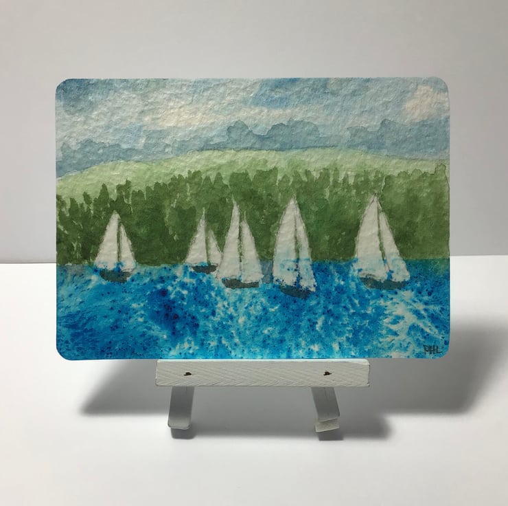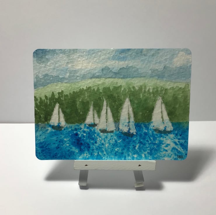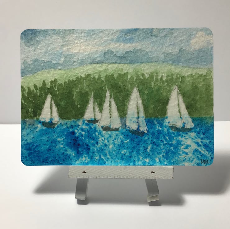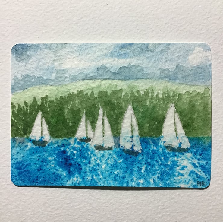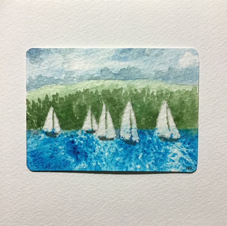 Inspired by yachts racing on Lake Windermere, I have painted it with professional watercolour paints and Brusho onto 300 GSM paper.
