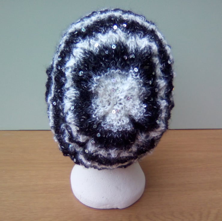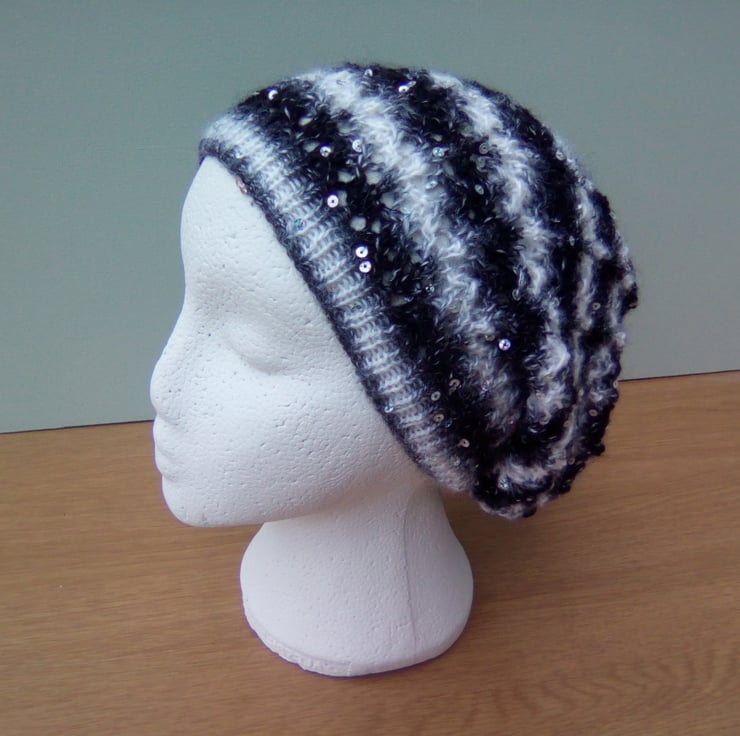 Hand knitted in a wool and acrylic blend yarn with sequins and a pretty lace design