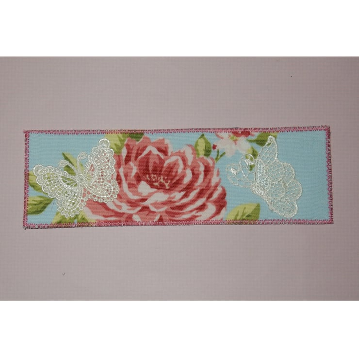 A very pretty bookmark, measuring 2.5 x 8 inches. This is made from pretty floral fabric, with the addition of two lace butterflies. The edge is stitched in matching pink thread.