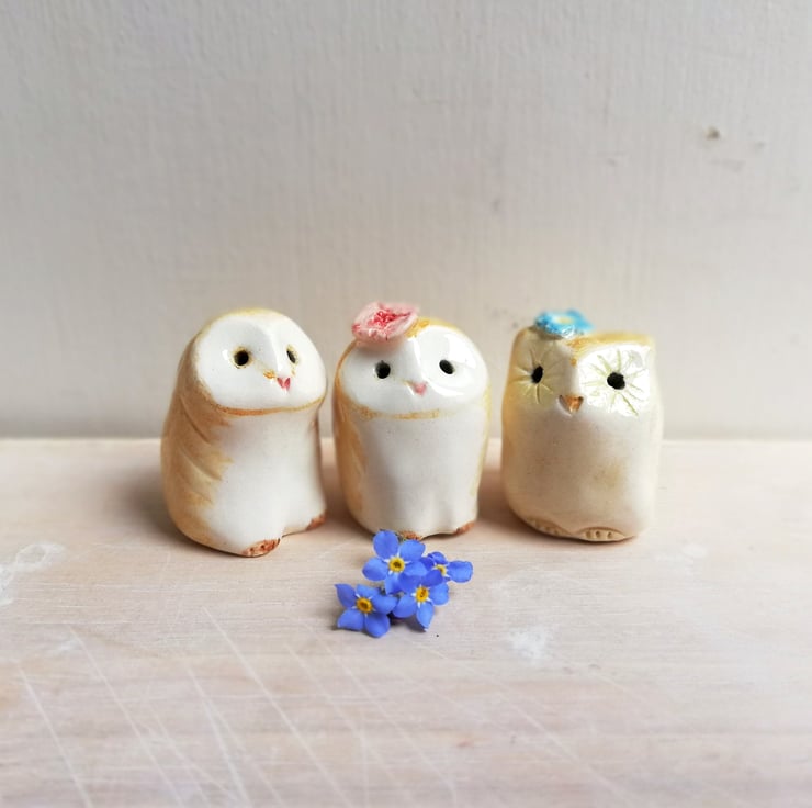 Handmade owl figure in white clay, hand painted and glazed in clear glaze.