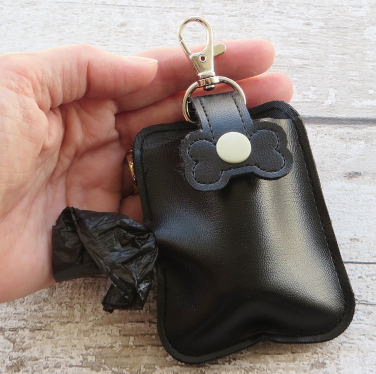 The soft pouch is made using vinyl so no noisy holders bashing annoyingly against the lead. The waste bags are fastened securely inside the pocket with a cute bone shaped tab and Kam Snap in a colour to match your chosen embroidered name and the bags pull out easily through the opening at the side of the pouch. There is a lobster clasp which can be used to clip the pouch to your lead, bag, clothing, keys, anywhere that is handy while you are out walking with man's best friend.
