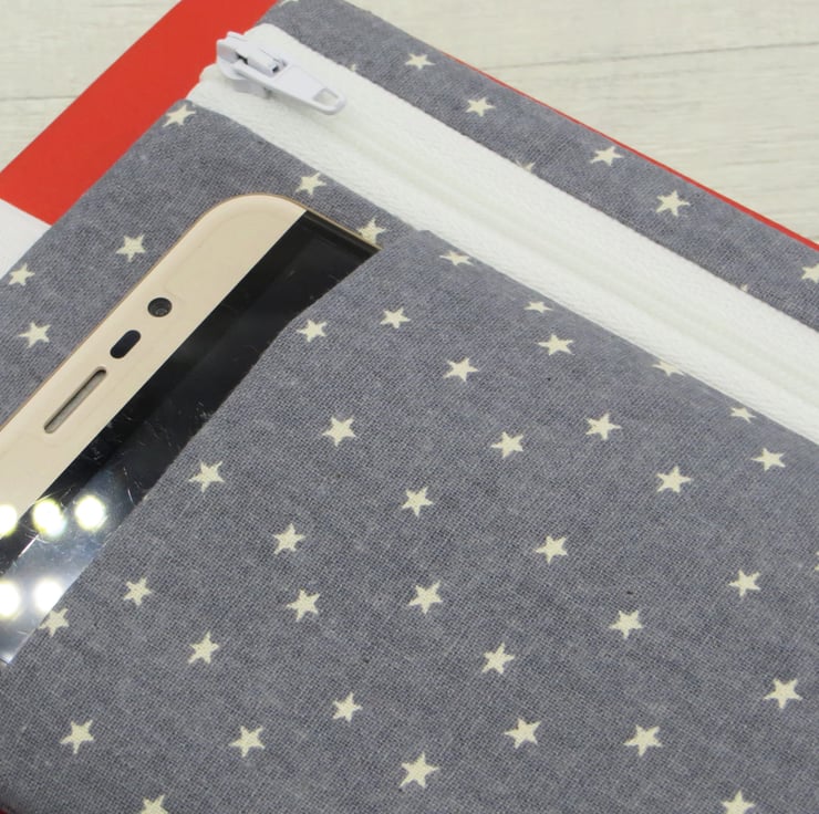 This beautiful and practical zipped pouch can be attached to the front of any hardback book, bullet journal, diary, notebook or planner with 3/4" elastic strap, keeping it safe and secure. But best of all, it keeps your pouch handy, its always there when you need it. The zipped pocket is perfect for your bullet journal accessories, including, stencils, pens, and washi tape. It is lined with white waterproof material making it easy to keep clean. There is a handy pocket on the front for you to put your mobile phone (up to 5.5" phone) or maybe just some pens.