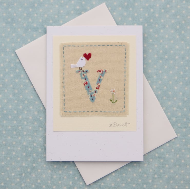 A small hand-stitched textile mounted onto a card with the letter 'V' cut from pretty fabric stitched into place with tiny stitches. I have added a miniature applique dove with heart in her beak, and then embroidered a tiny daisy flower to complete the design.