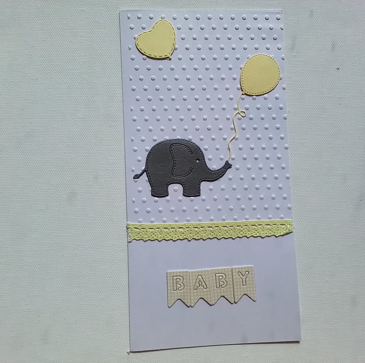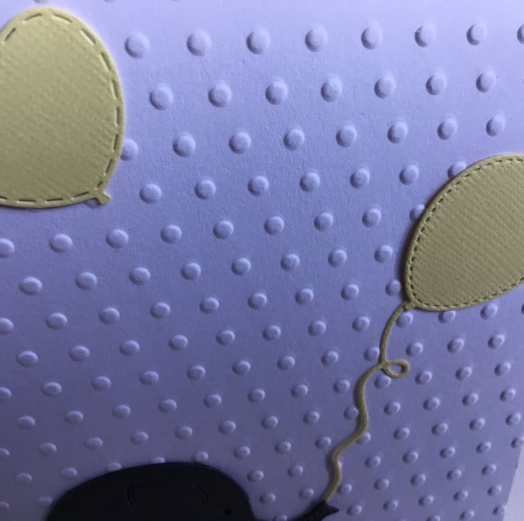This cute, tall card has been handmade and embossed with spots at the top where a cute elephant sits holding a balloon. A lemon coloured heart also tops the card.