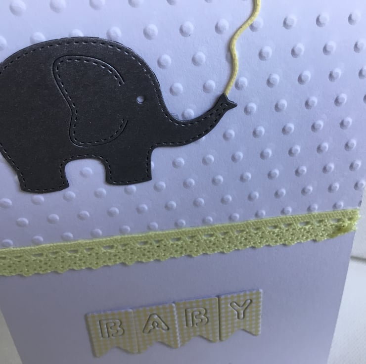 Across the card is a pretty lemon coloured ribbon and the words on bunting saying 'Baby'.