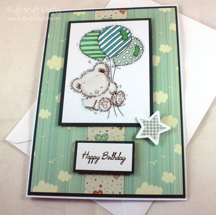 Handmade birthday card featuring a hand coloured image of a cute bear floating around with three balloons. The image and the sentiment 'Happy Birthday' are both framed in teal coloured card over a cloud patterned background. The card is embellished with a small card star.