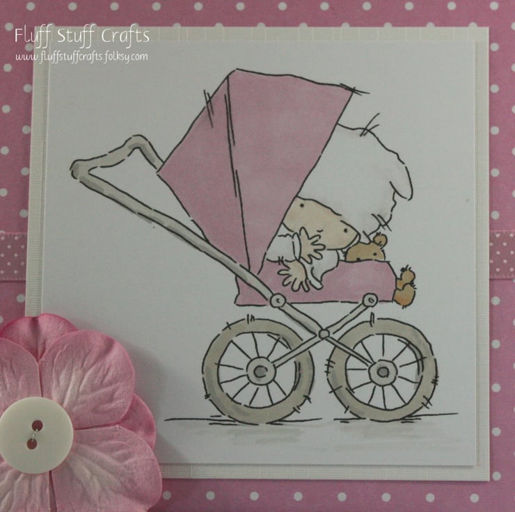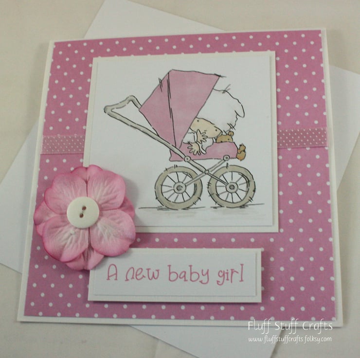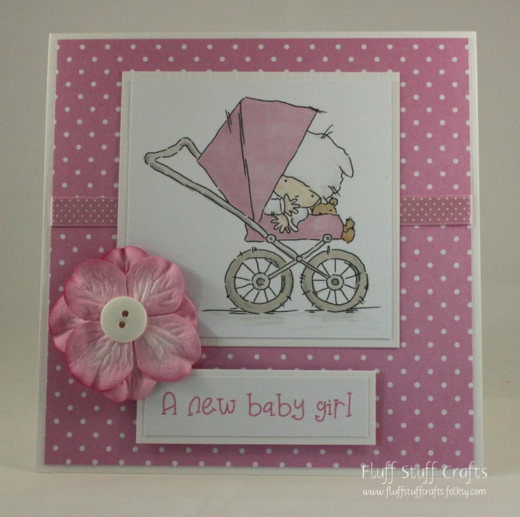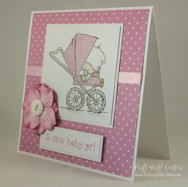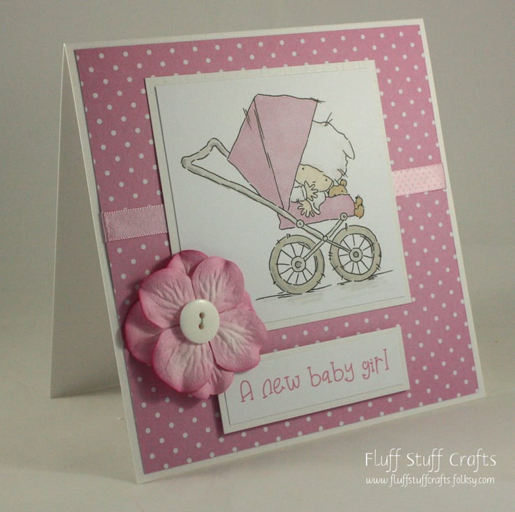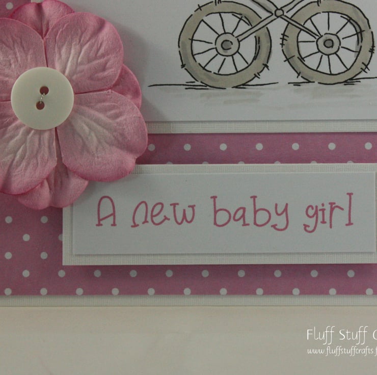 The image and the sentiment 'A new baby girl' have been framed with white linen card, over a bright pink polka dot background paper. The card is embellished with a length of pink polka dot ribbon and pink paper flowers with a white button centre.