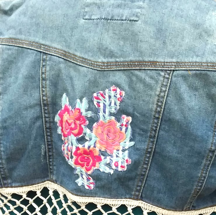I don't like to throw anything away and love how good quality clothing can be found at bootfairs and charity shops. I have given this denim jacket a new lease of life by heavily cropping it into a different style, and adding a long fringe and a pretty appliqued floral fabric decoration on the back.