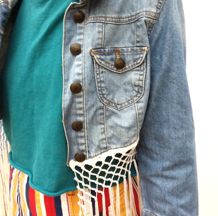 Vintage denim jacket cropped and embellished with a long tassel fridge around the hem. Printed fabric floral posy appliqued in the centre of the jacket back.