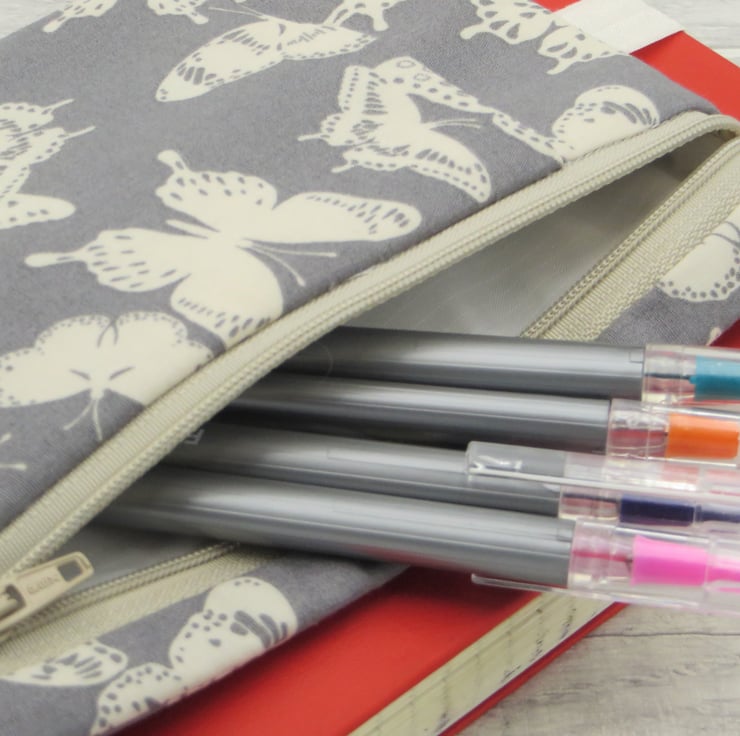 A lovely zipped pouch made from a butterfly patterned cotton fabric is the perfect addition to your bullet journal, planner or diary. Inside the zipped case which is fully lined with easy clean waterproof fabric, you can store your bullet journal accessories like pens, pencils, washi tape, stickers, clips or stamps. With the 3/4 inch elastic attaching it snugly and securely to the front of your planner, you can be sure that your supplies will be kept safe and handy. No need to ever be missing a pen again when you want it. The slip pocket on the front will accommodate a mobile phone up to 5.5 inches.
