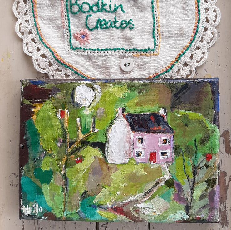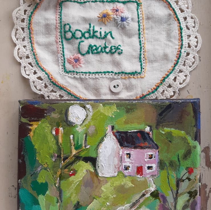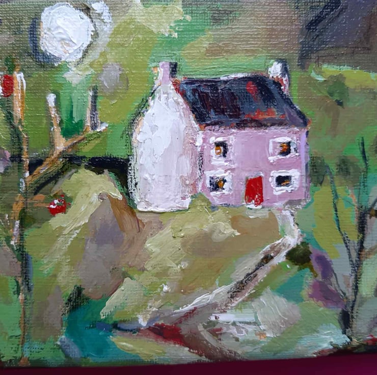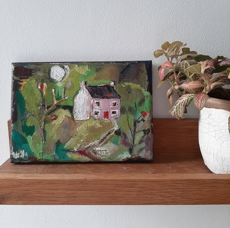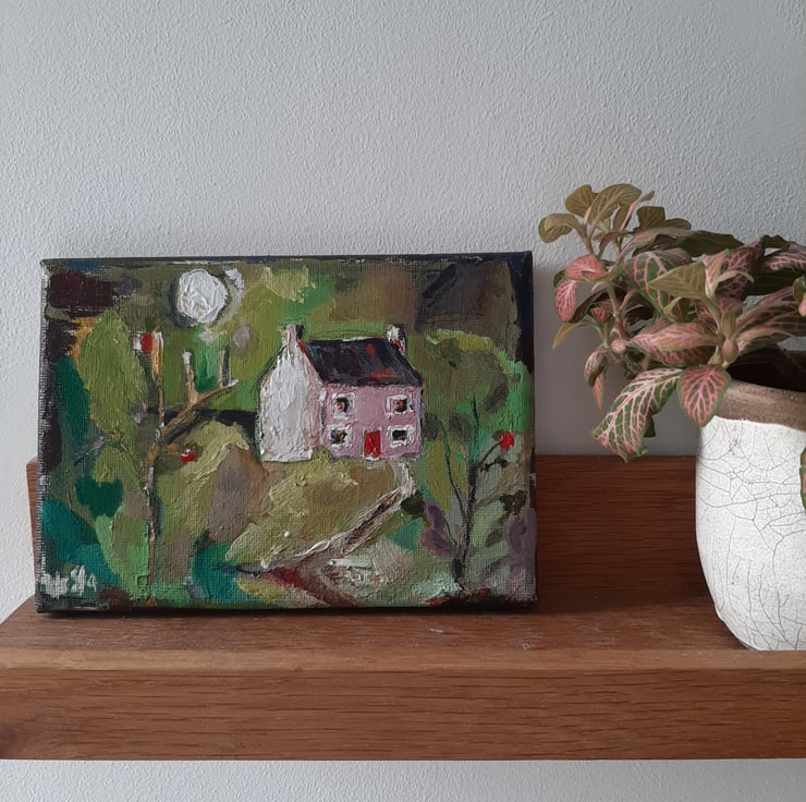 Under a bright white moon, the last few apples shine. This original painting of a sweet pink house with a bright red door measures approximately 17 cm long x 12cm width.