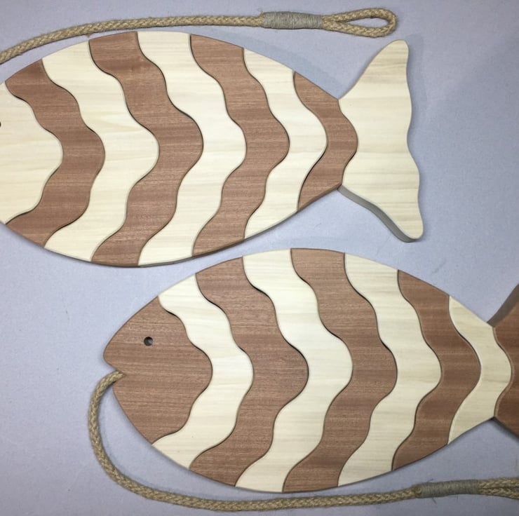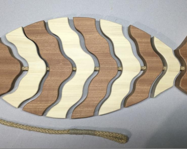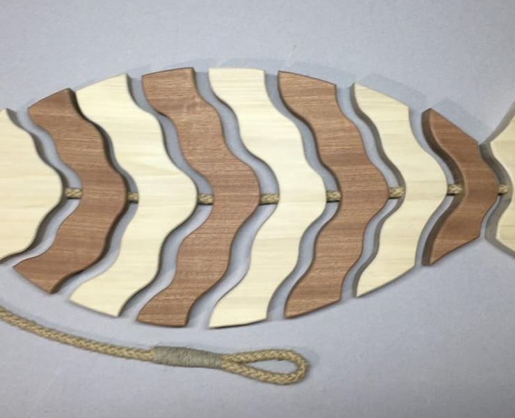 Stripy Fish Trivet, designed and handmade by me from Sapele and Tulipwood, Jute Cord and Flax Twine. To use your Trivet: For one dish, keep your Trivet closed then place the hot dish onto the Trivet: For more than one dish spread the Trivet segments out along the Jute Cord, however you like, then place the hot dishes on the extended Trivet. When extended the Trivet is the perfect length for a standard dining table. When not it looks great hanging on the wall. or laid down on any surface.