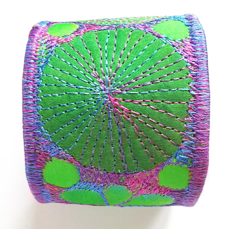 Made from layers of fabric including hand dyed Egyptian cotton and silk fabrics using the free machine embroidery style of sewing