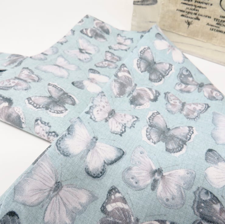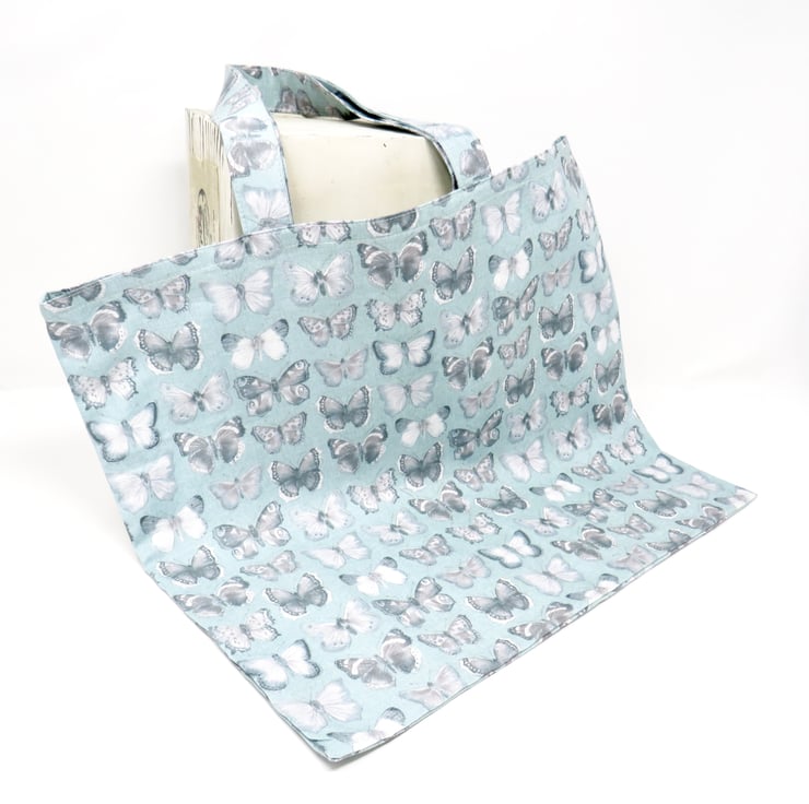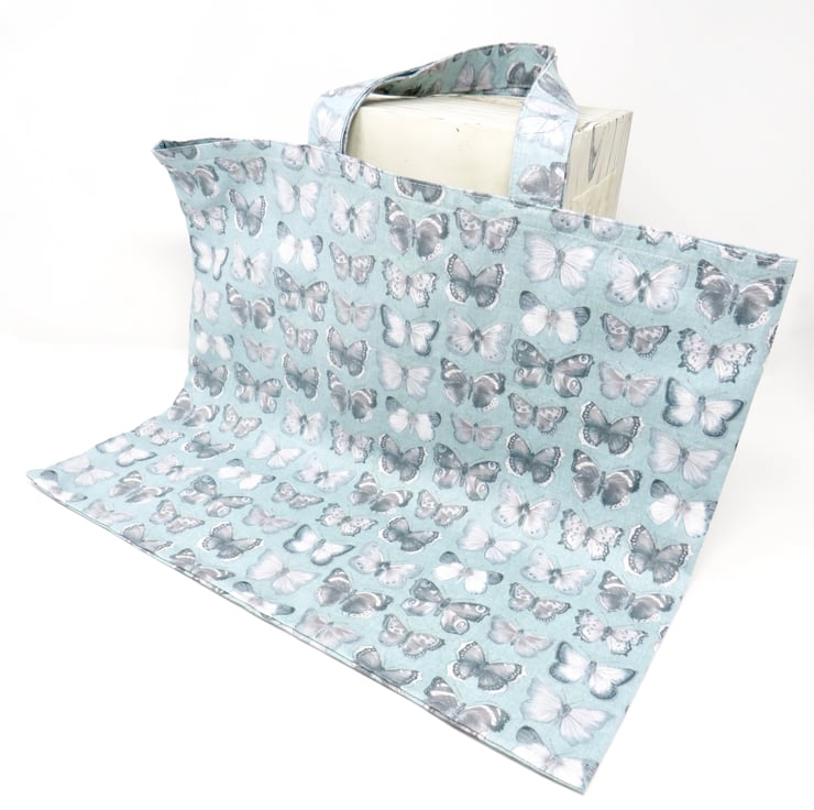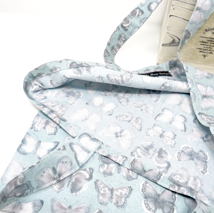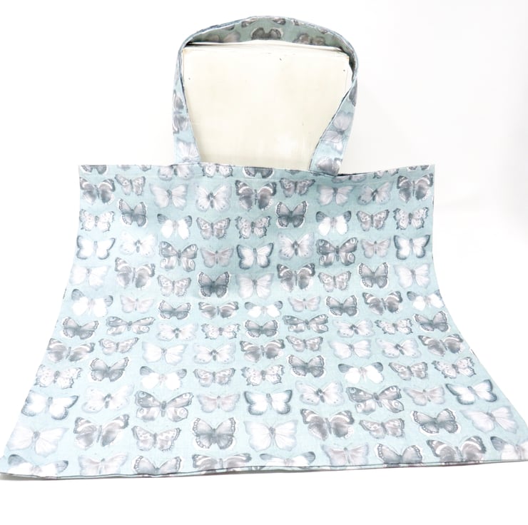 This useful shopping bag has been made in cotton with a light teal butterfly print. It is unlined, meaning you can fold it up small enough to fit in your handbag, and all the internal seams are professionally overlocked. I've made the handles wide so they don't cut into your hands when carrying. Keep one in your bag and you will never be caught out when making impulse buys. Cheaper in the long run than buying plastic carriers every time you shop and it's kinder to the environment too!