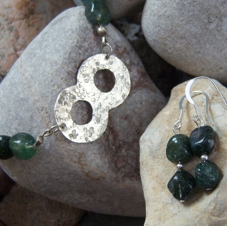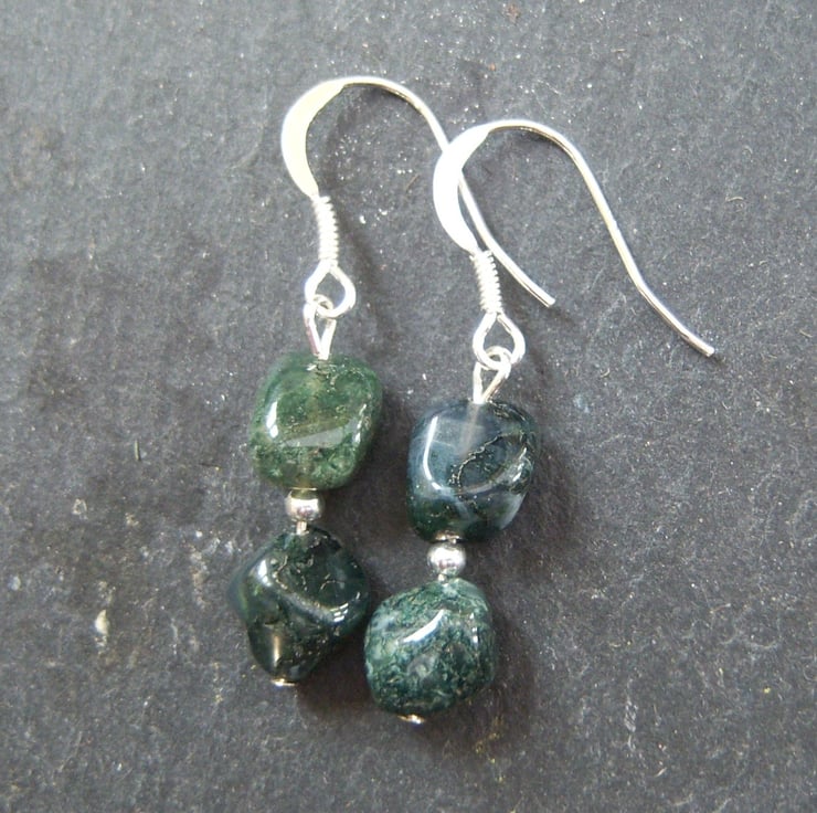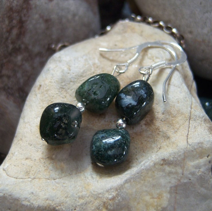The earrings are also moss agate with a sterling silver bead inbetween the two stones. The drop is approximately 2cms.