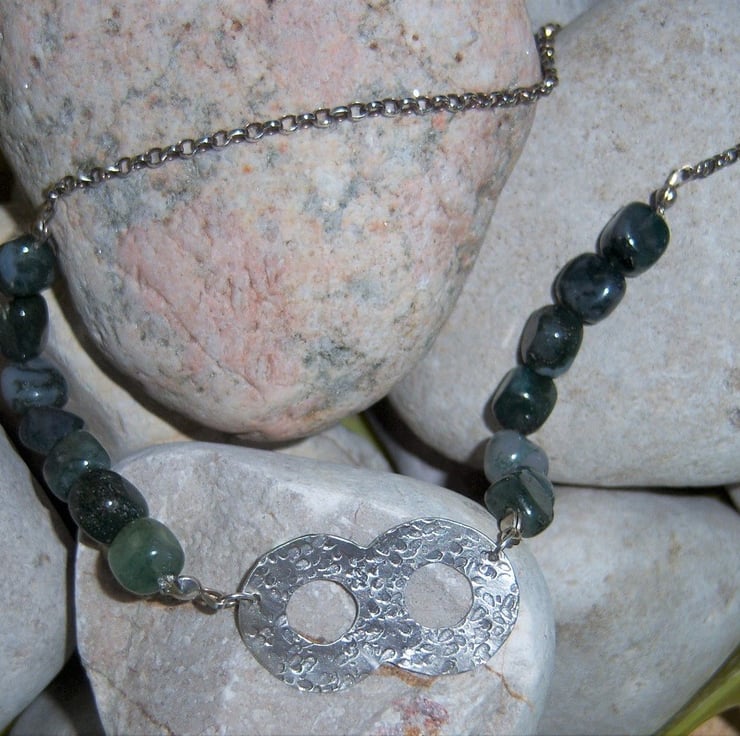 Infinity symbol cut from sterling silver sheet and textured with a flower imprint, approximately 3.5 x 2 cms. The necklace has nugget style (knobbly) moss agate gemstones and are threaded on double nylon thread for extra strength. The stones are shades of muted green and greys. A sterling silver belcher chain finishes the piece. The full length is 16.5 inches as this is meant to be worn snuggly at the base of the neck, not to dangle.