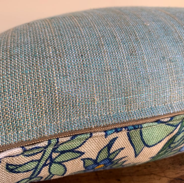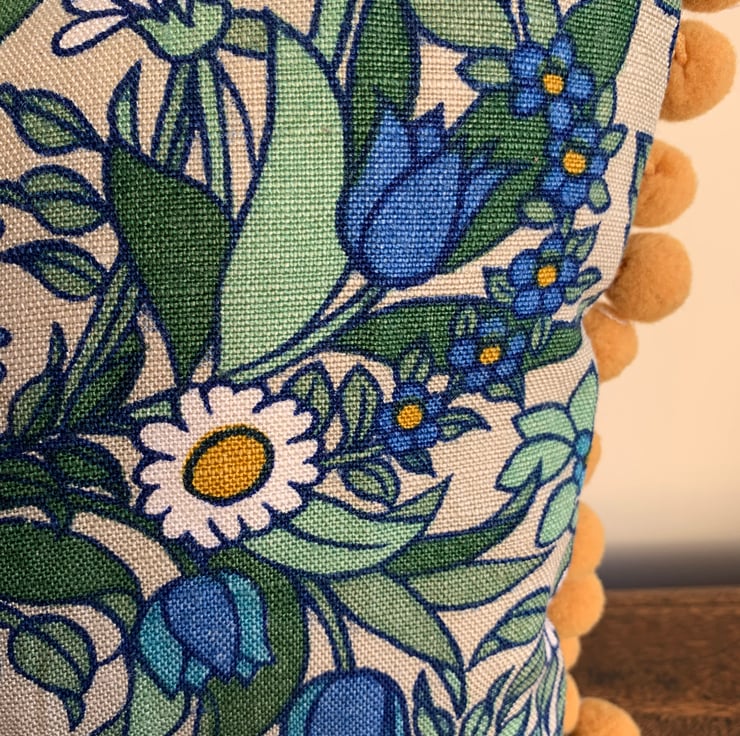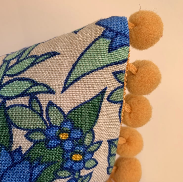 The cushion is backed with a soft green Sanderson linen mix weave and finished on the ends with mustard bobble trim which picks out the colour of the flower centres.