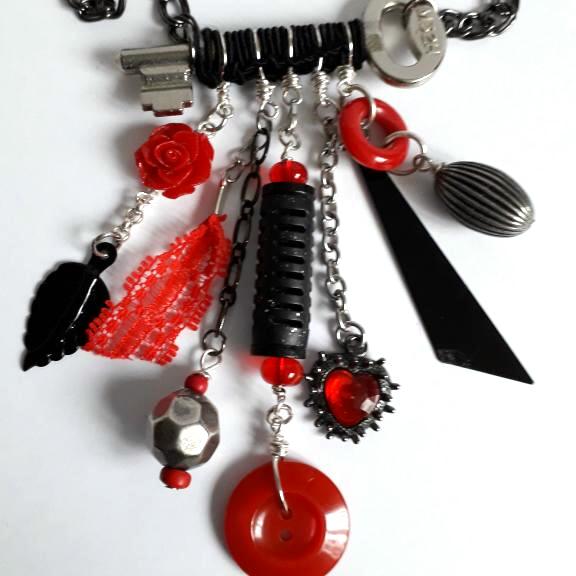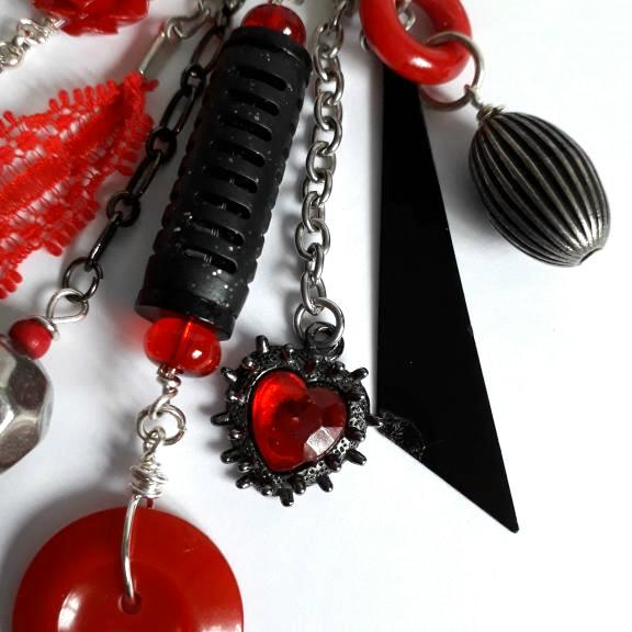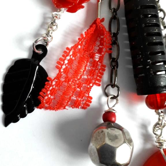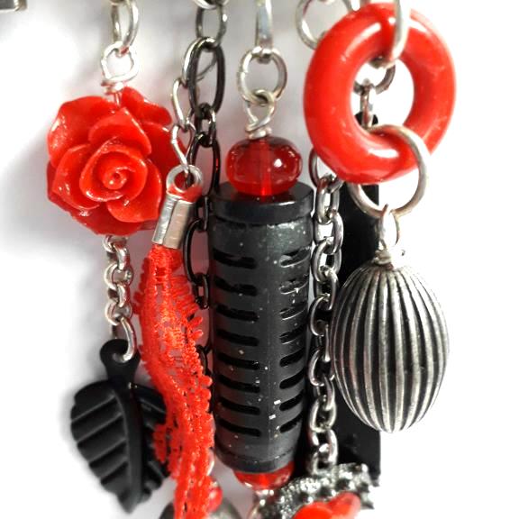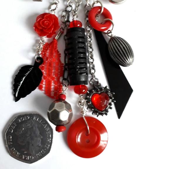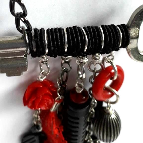 I have used metal, glass and wooden beads, pieces taken from broken jewellery and other items inc a black rubber pen top, red plastic ring and a piece of red lace, to make up the 5 dangles, the key has been wrapped with black cord, the longest dangle is 11cm/4.5" long.