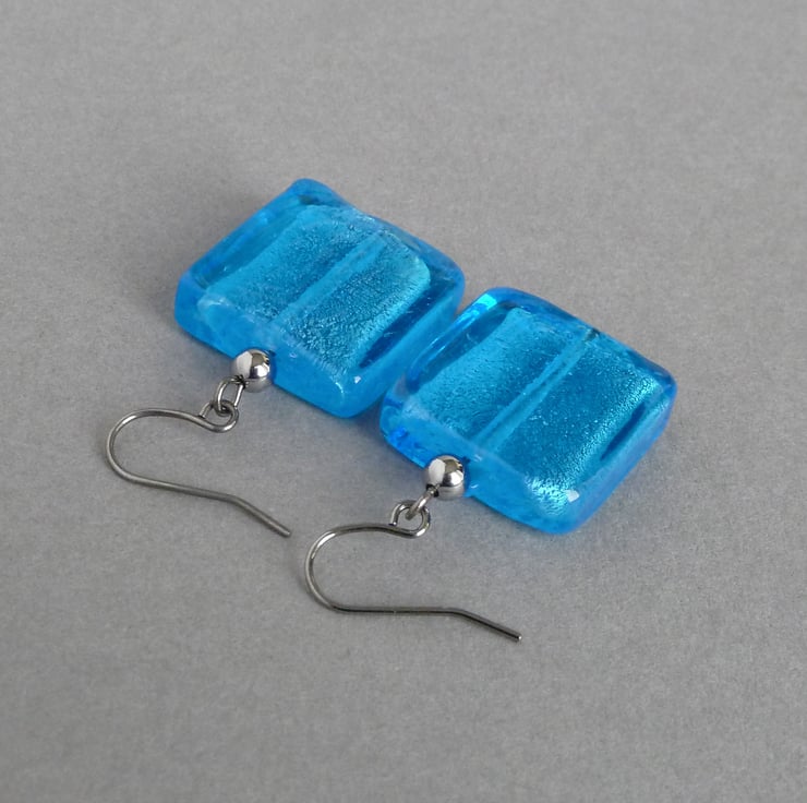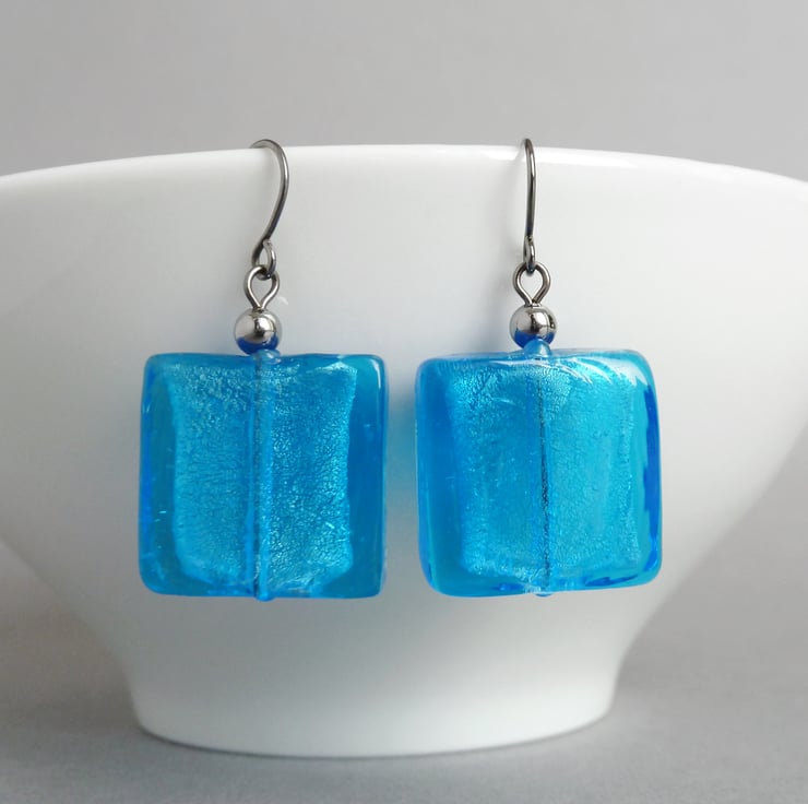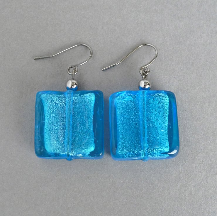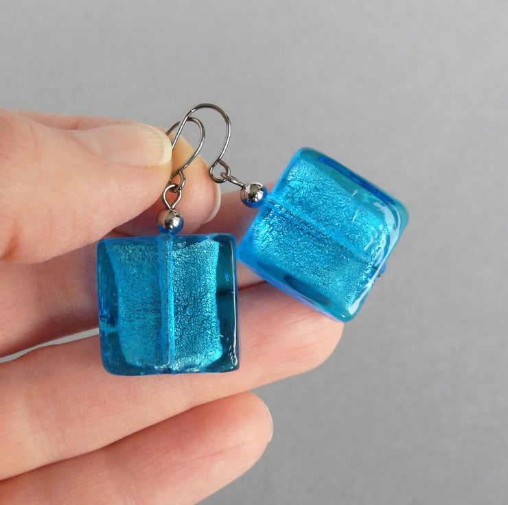 The large glass squares used to create these cyan fused glass earrings are created by fusing fine sheets of silver foil between layers of bright blue glass, which gives the beads a beautiful, metallic shimmer. These big dangle earrings are great for adding a pop of colour to your outfit and make great gifts for women who like colourful, statement jewellery.