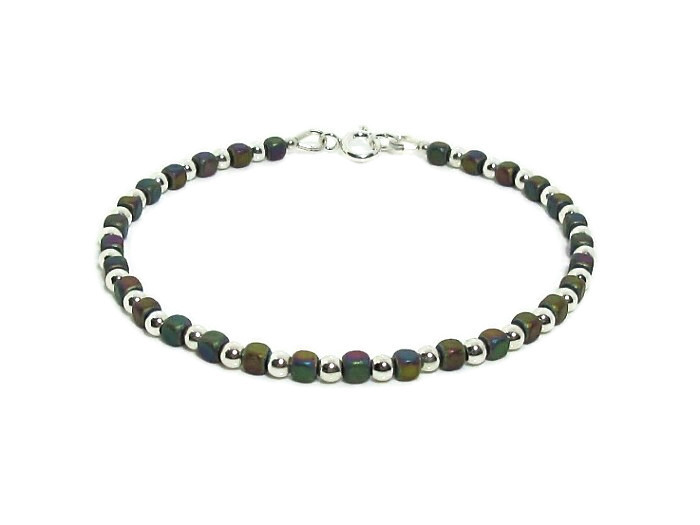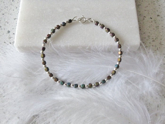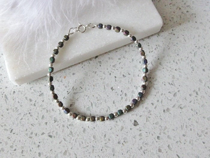 For this tiny beaded, original design bracelet I've used non magnetic matte Rainbow Hematite square cube beads, which are just 3mm in size & are all around this bracelet. These semi precious gemstones have rounded edges, so they're not sharp at all.