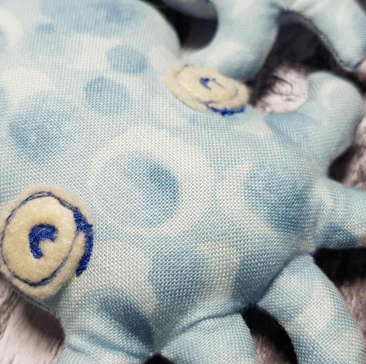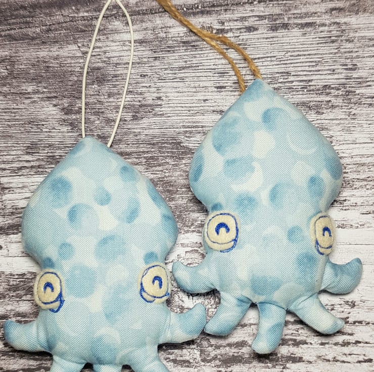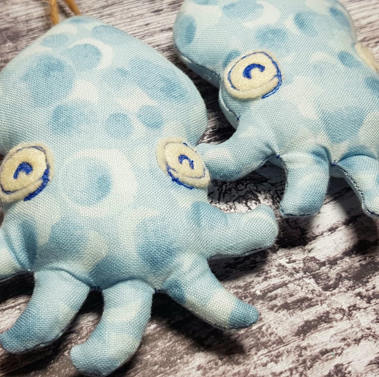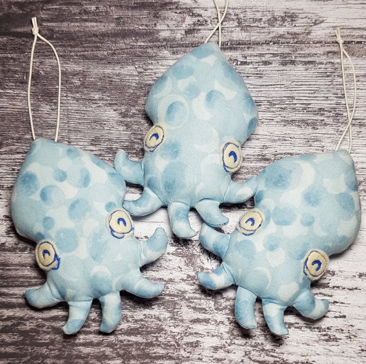 These cute baby cephalopods are made with Lewis and Irene cotton from my own original design. They have free motion embroidered felt eyes and measure roughly 11cm tall and 8cm at their widest. They are hung with either twine or waxed cotton thread, the choice is yours. They would make a great gift for ocean creature lovers and would look quirky and sweet alongside a nautical themed room.