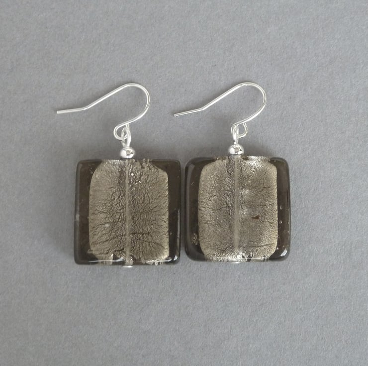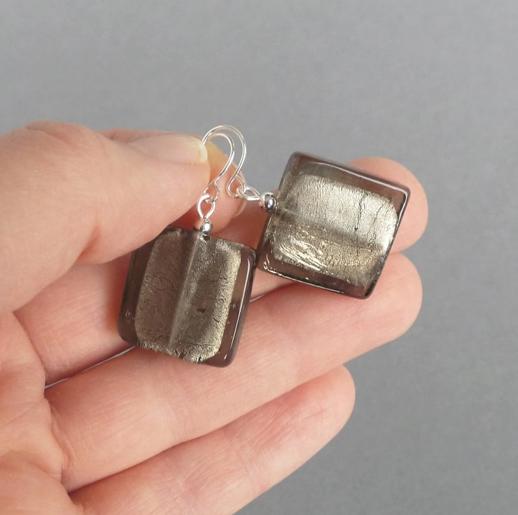 The large fused glass beads used to make these dark grey square earrings are created by enveloping fine layers of silver foil within charcoal grey glass. This trapped foil gives the beads a lovely, metallic shimmer. These grey dangle earrings are great for adding a splash of colour to your outfit and make great gifts for women who like colourful, statement jewellery.