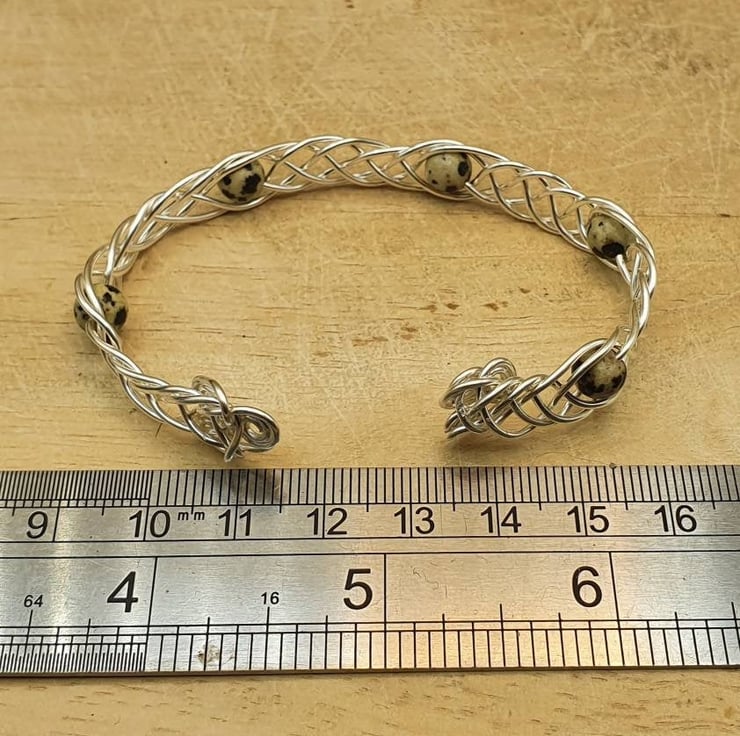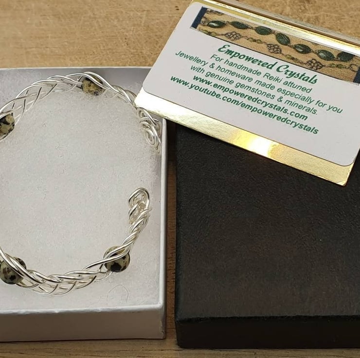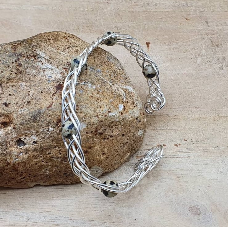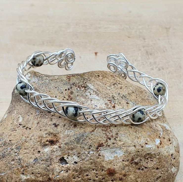 This is a dalmatian jasper adjustable cuff bracelet. Wire wrapped with silver filled wire.