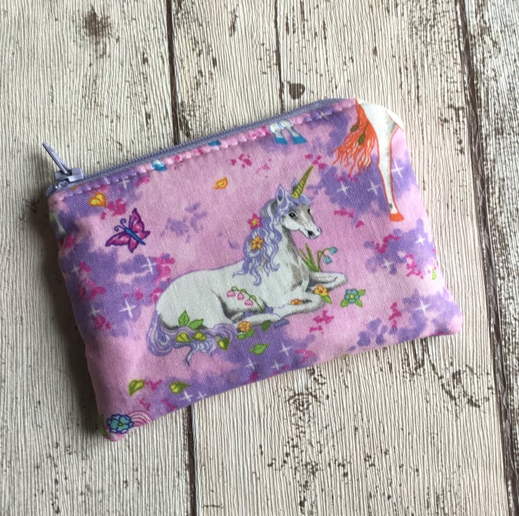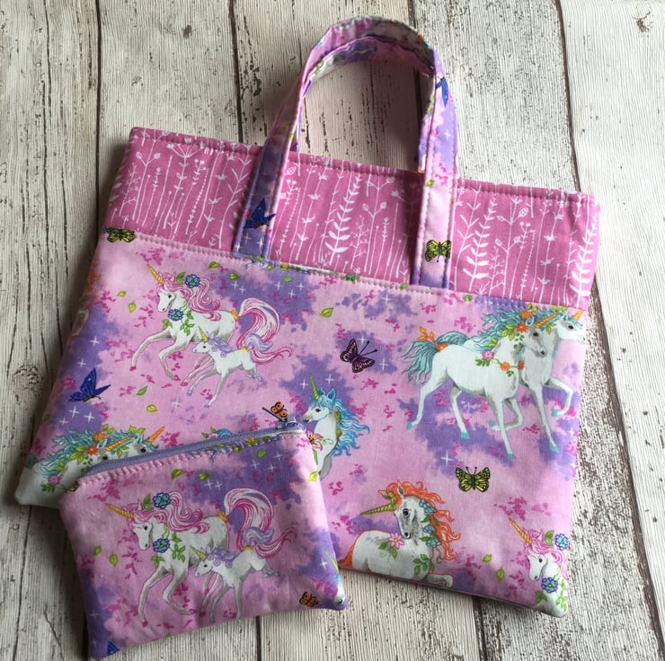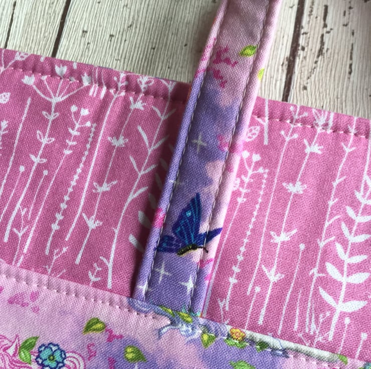 This delightful little duo would charm any little girl and perhaps start her on her handbag collection! Made from a cotton fabric with a background in pink and mauve the white designed unicorns have blue manes, tails and hooves and are decorated with flowers, stars and butterflies, magical.