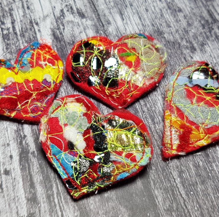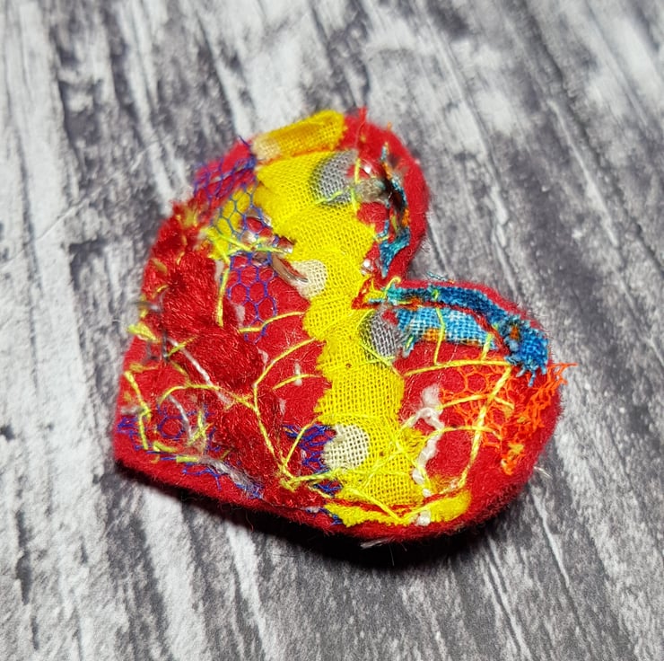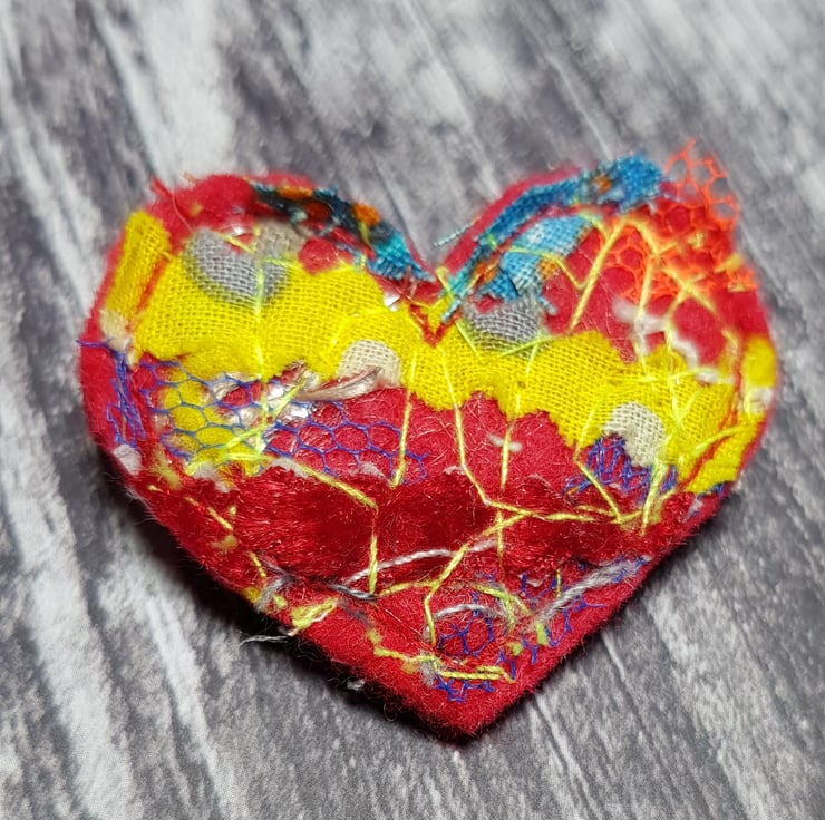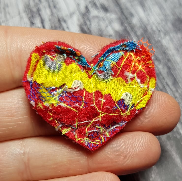 Each heart brooch is unique, made from scraps, off cuts and yarn I've saved and free motion embroidered with highlighter thread. The heart is then backed with another layer of felt and hand cut. A sweet and sentimental gift for a loved one or an interesting and beautiful piece for yourself.