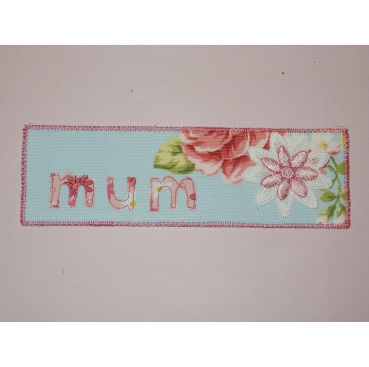 This is a very pretty bookmark, measuring 2.5 x 8 inches. It is made from pretty floral fabric, with the addition of an applique flower and the word "Mum". The edge is stitched in matching pink thread.