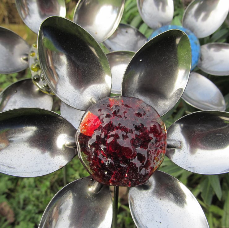 Each flower has been hand made by using metal tea spoons to form the petals and we have finished each of them with a fused glass centre which we have also made. This set consists of flowers with a red, yellow and turquoise centre.