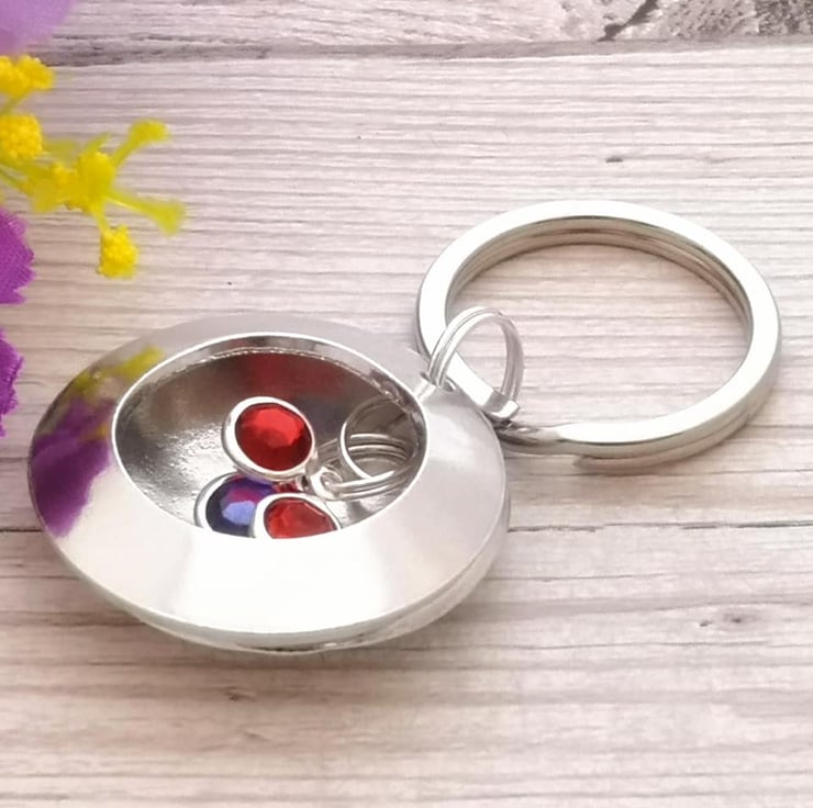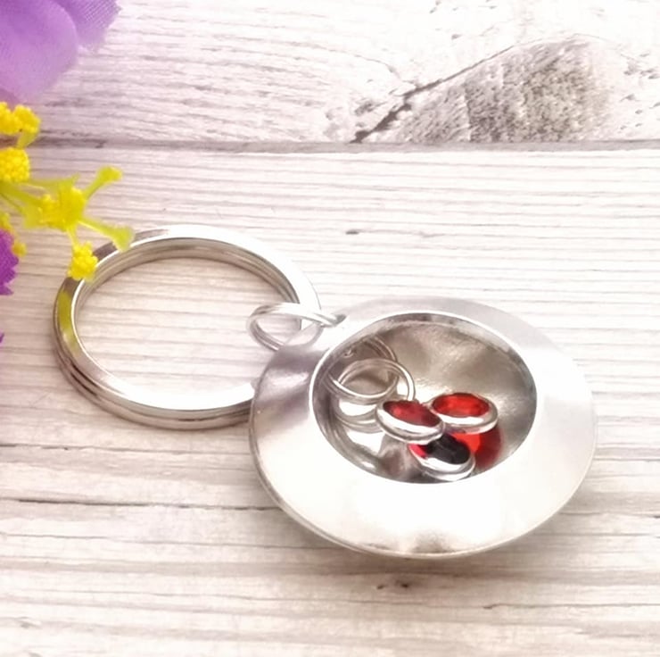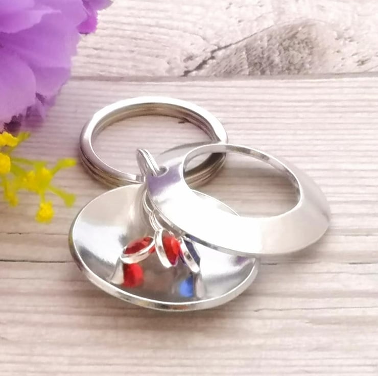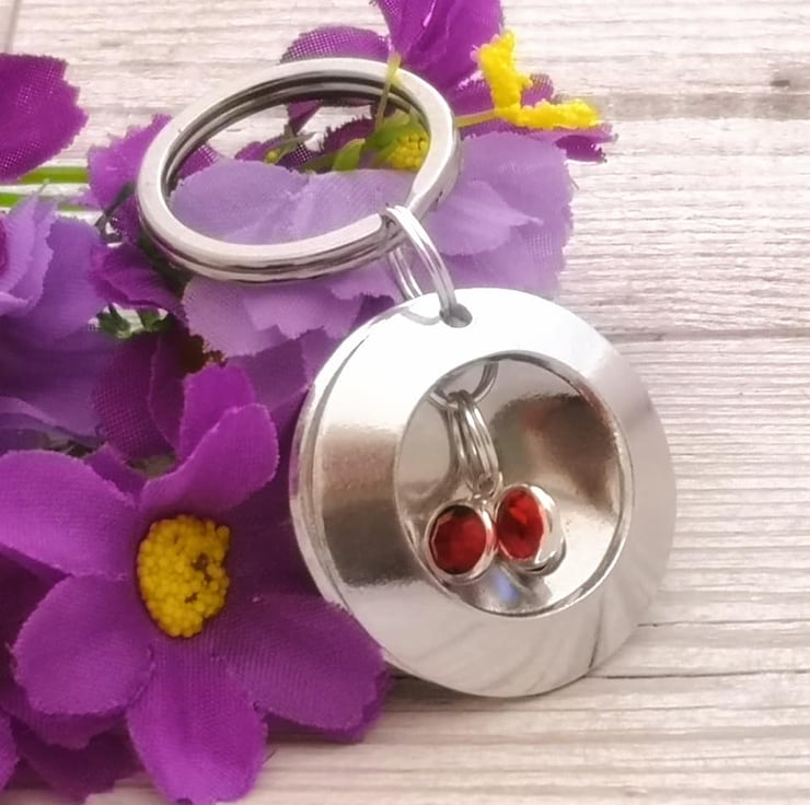 This metal keyring will be made to order by doming each shape by hand. They are then polished and finished by adding birthstone crystals.