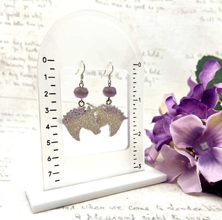 The wooden unicorn shapes themselves measure 3cm tall by 3cm wide. The total drop is approximately 5cm, as I have added a lovely lilac faceted cats eye rondelle glass beads above the Unicorn and attached to the ear wires.