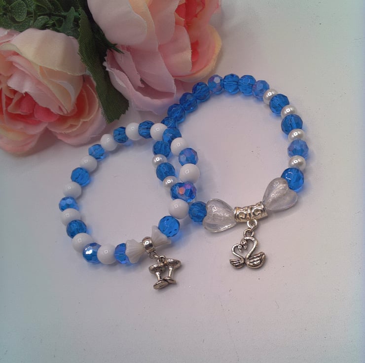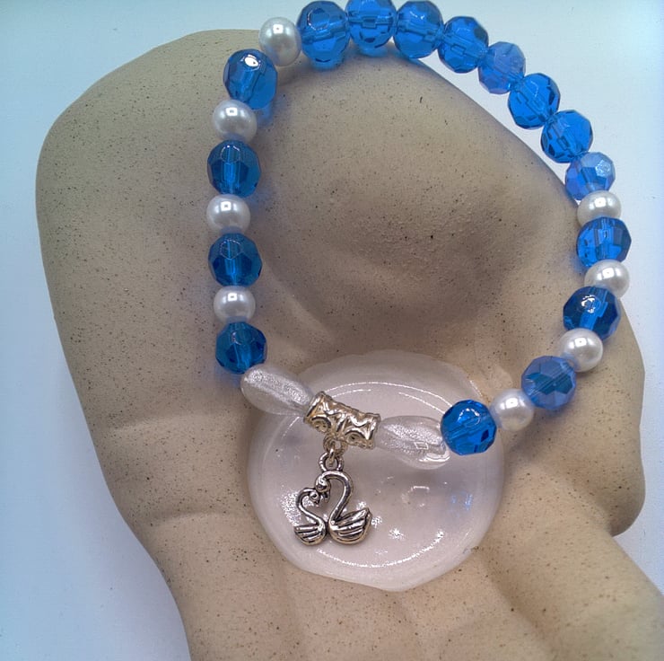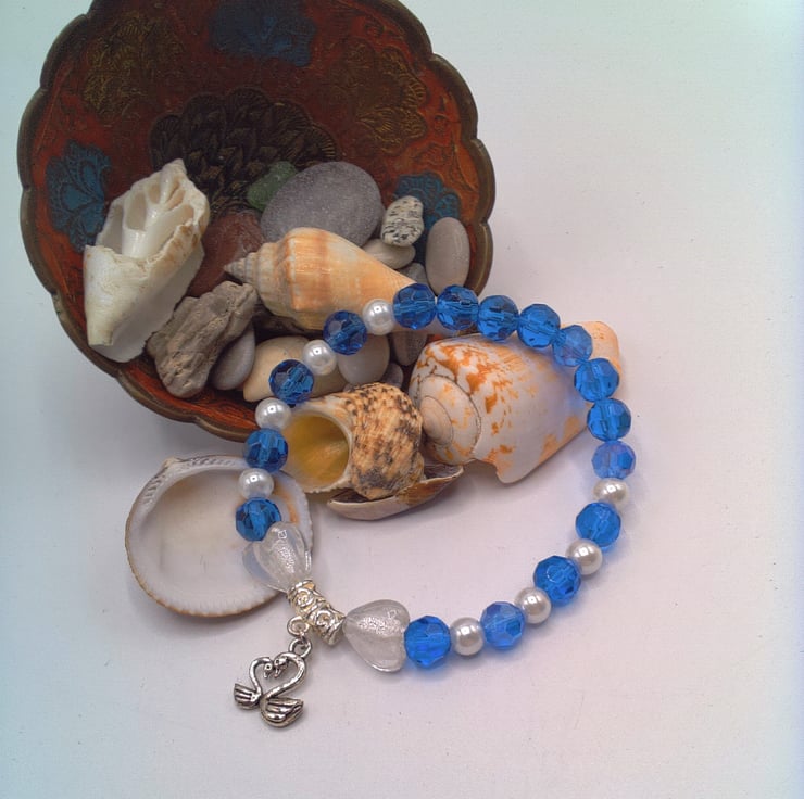 Option 1:The bracelet is made using 8 mm blue faceted glass beads, 6 mm white glass pearls, two 12 mm x 12 mm clear glass heart beads with a 12 mm x 12 mm silver plated charm showing 2 swans, threaded onto jeweller's elastic. The bracelet measures 17 cm in its unstretched state and will comfortably fit a wrist that is 17 - 17.5 cm in circumference.