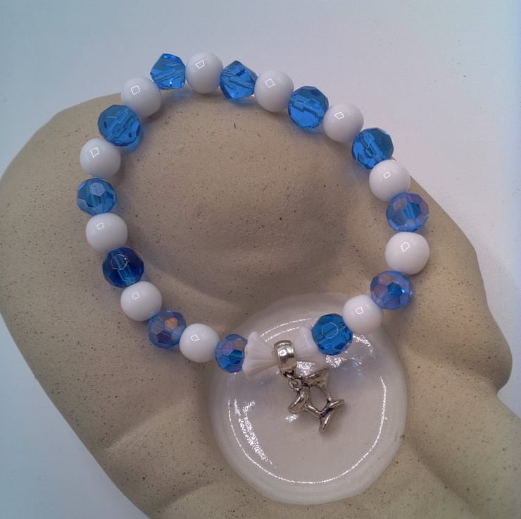 Option 2: The bracelet is made using 8 mm blue faceted beads, 8 mm white glass beads and two 8 x 8 mm white flower beads with a 12 mm x 12 mm silver plated champagne glasses charm all threaded onto jeweller's elastic. The bracelet measures 16 cm in its unstretched state and will comfortably fit a wrist that is 16.5 - 17 cm in circumference.
