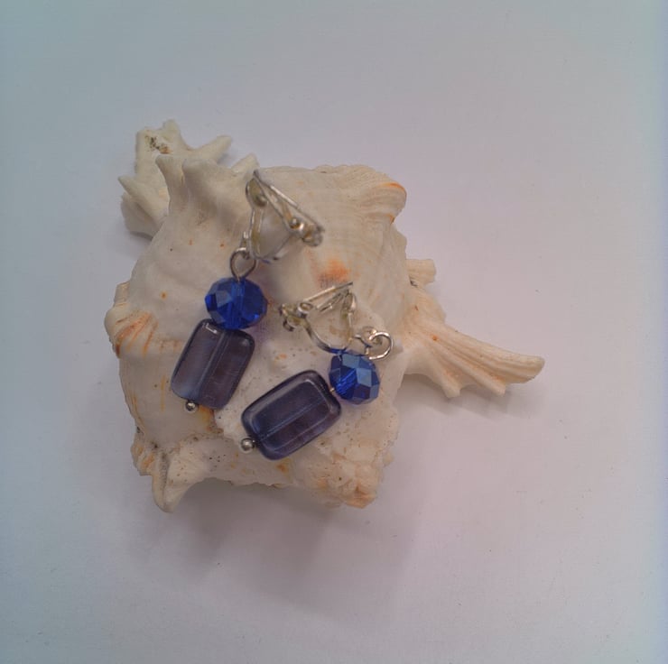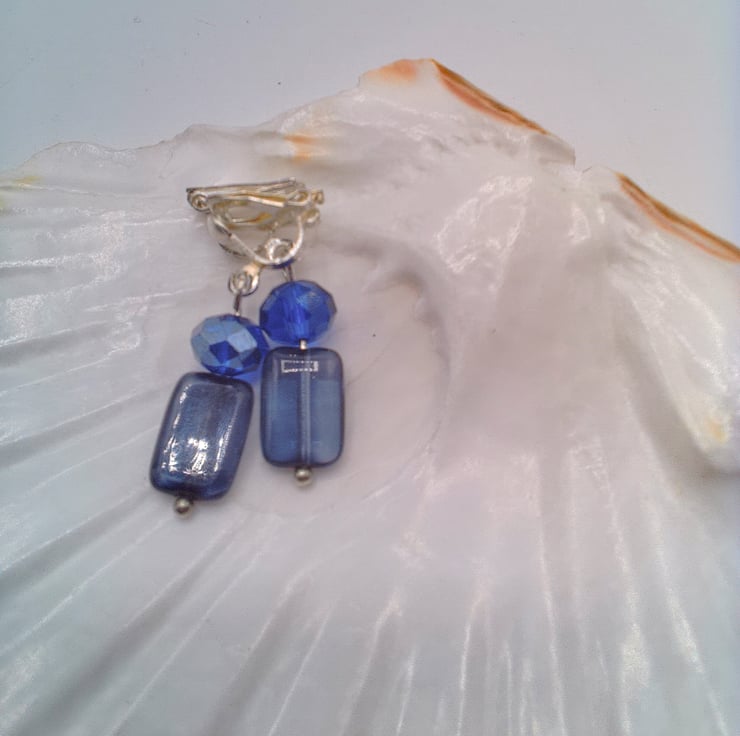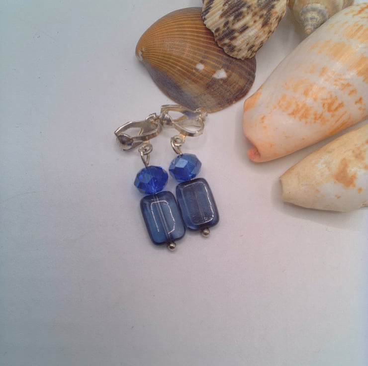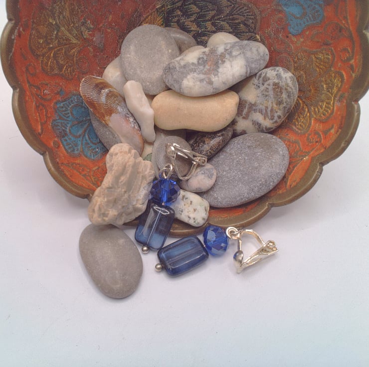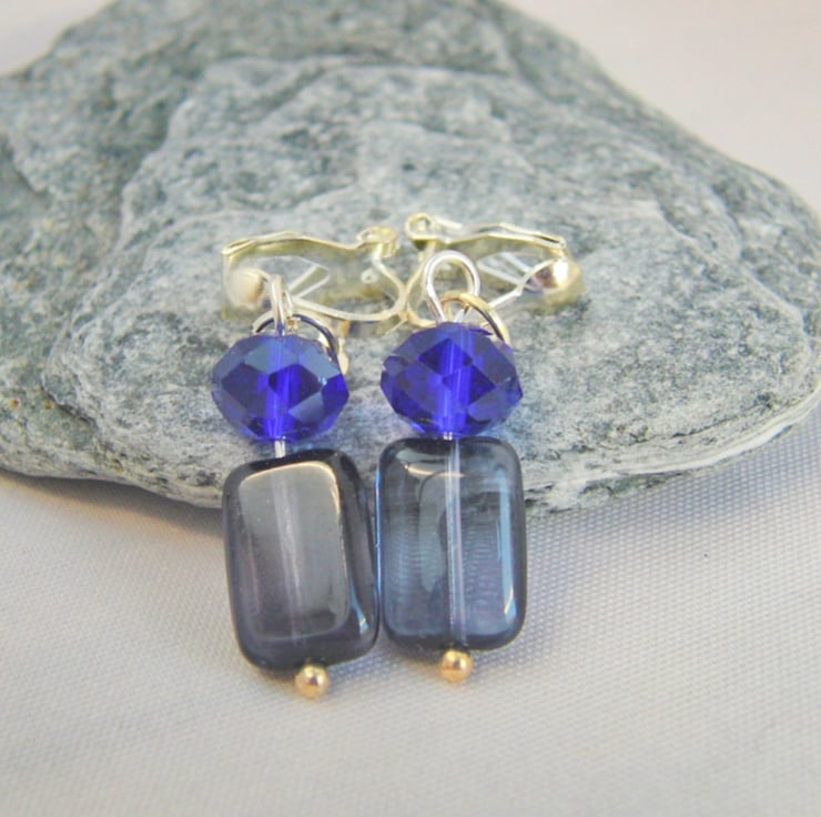 These pretty clip on earrings are made especially for those who do not have pierced ears but would love to wear earrings. They would go well with any outfit you wear everyday or for a casual evening out. They would make the perfect gift for a friend or relative for a birthday or anniversary, or a treat for yourself. The earrings are made using 10 x 6 mm rectangular navy glass beads with 8 x 6 mm cobalt blue crystal rondelle beads suspended on silver plated clip on back with a drop of 2.25 cm from the base of the earring back. The earrings will be dispatched wrapped in tissue paper in an organza bag and delivered to you via Royal Mail first class post.