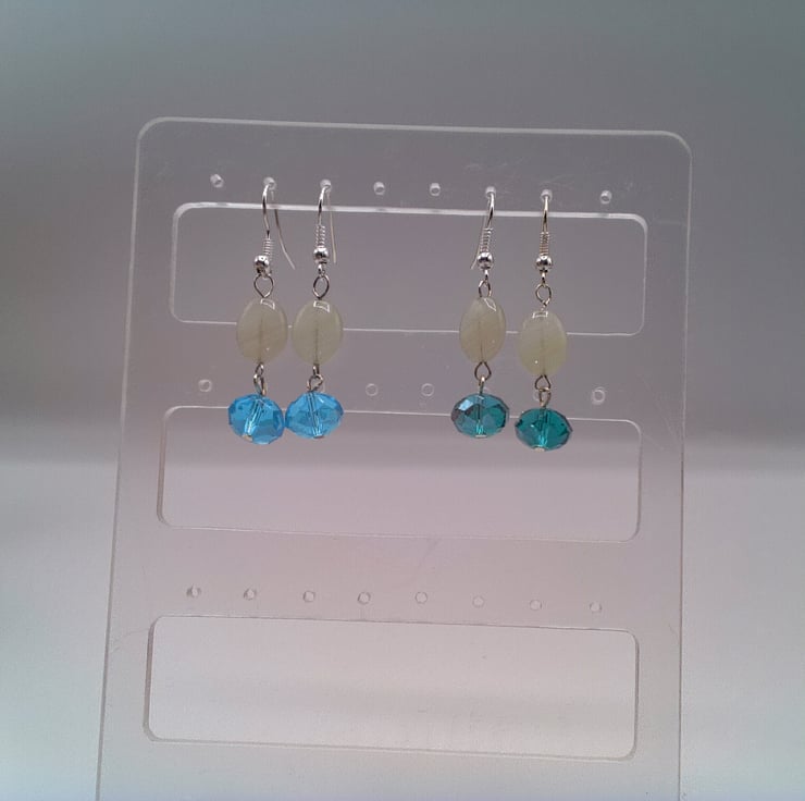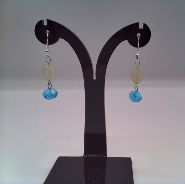 These pretty earrings would match well with any outfit you wear everyday for work or a day out or for a casual out. They would make a lovely gift for a friend or relative for a birthday or anniversary, or a treat for yourself. They are made using 12 mm x 10 mm white opaline oval beads, with an 8 mm x 6 mm teal or blue crystal rondelle bead. They are suspended on silver plated ear wires and they have a drop of 3 cm from the base of the ear wire.