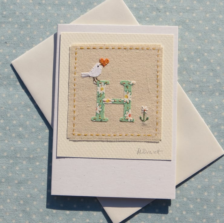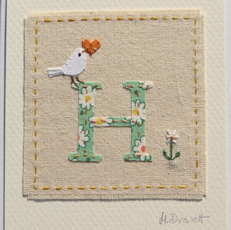 A hand-stitched card with the letter 'H' cut from pretty cotton fabric stitched into place with tiny stitches. I have added a miniature applique dove with heart in her beak, and then embroidered a tiny daisy flower to complete the design. There is room under the mounted textile to write an inscription, for instance: H is for Harry or any wording of your choice, just let me know. If you need a letter not currently in my FOLKSY shop, please contact me and I will gladly make one for you and list it within a day or two so you can buy it.