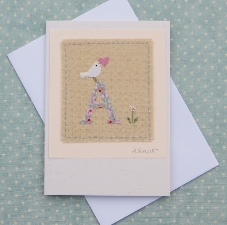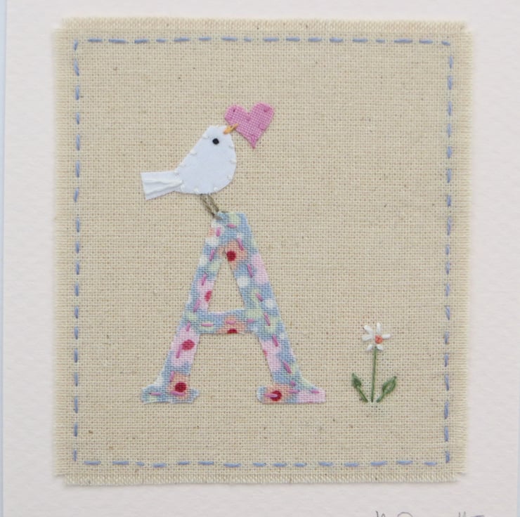 A small hand-stitched textile mounted onto a card with the letter 'A' cut from pretty fabric stitched into place with tiny stitches. I have added a miniature applique dove with heart in her beak, and then embroidered a tiny daisy flower to complete the design. There is room under the mounted textile to write an inscription, for instance: A is for Amelie or any wording of your choice, just let me know.