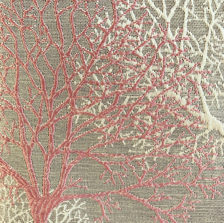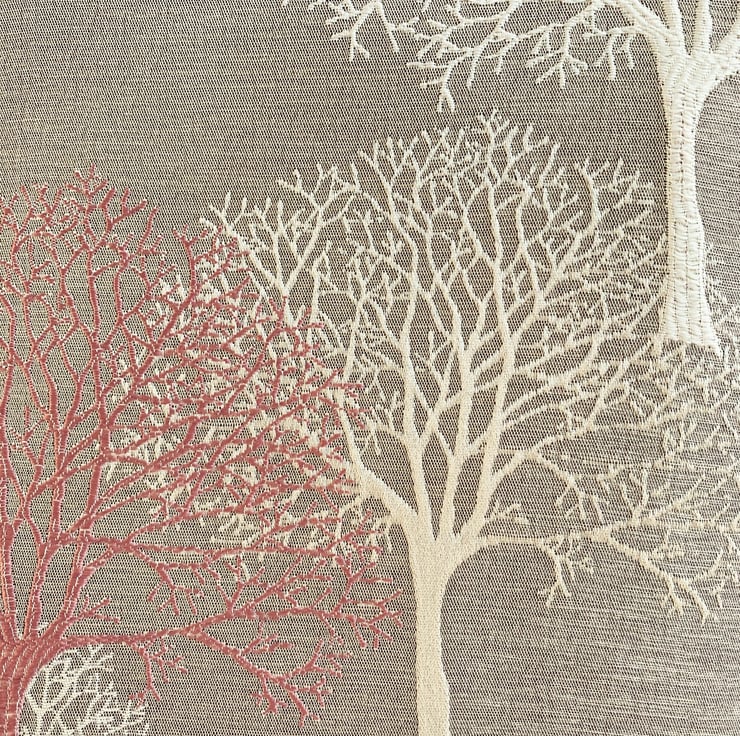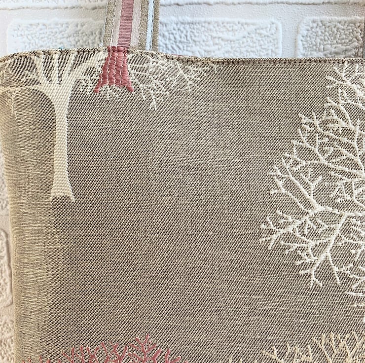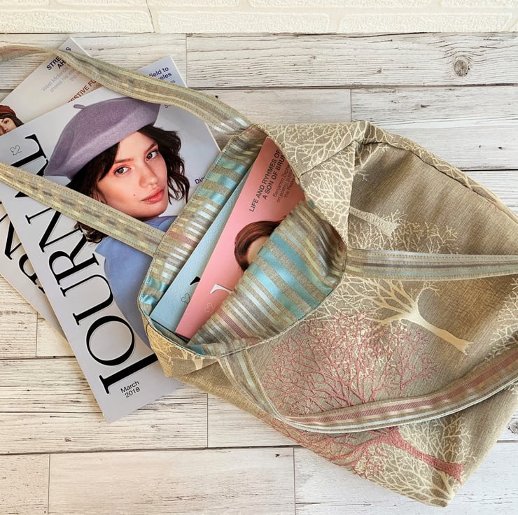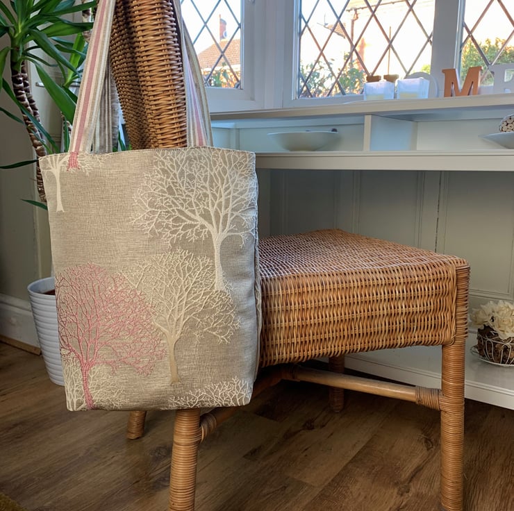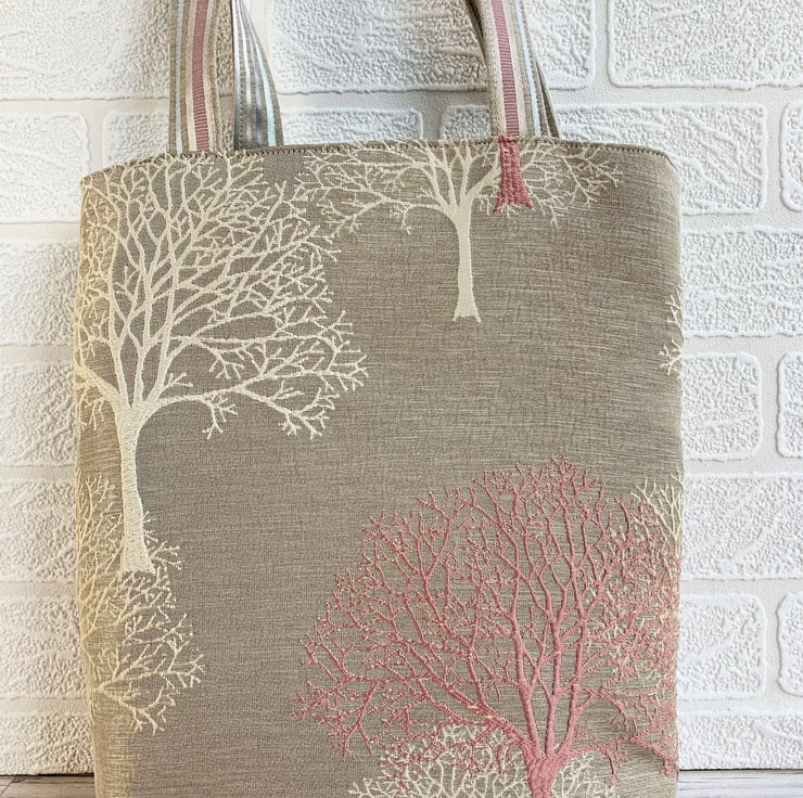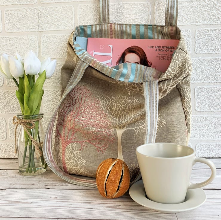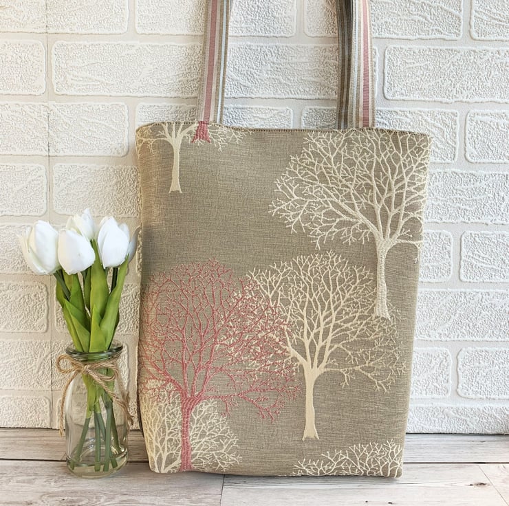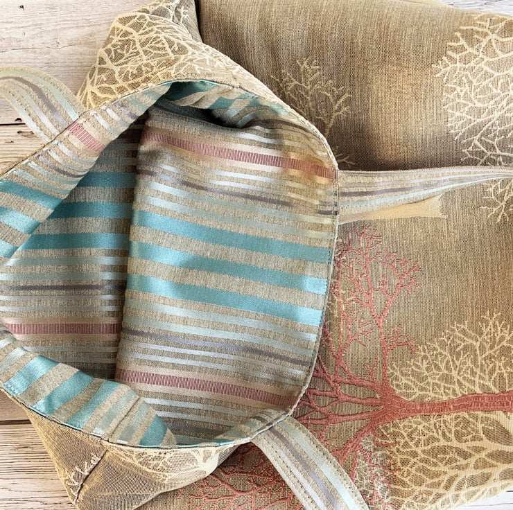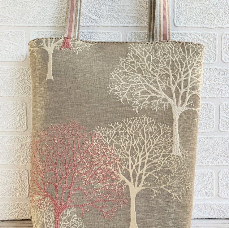 A lovely and handy tote bag in a beautiful patterned fabric. The luxurious fabric is beige with a slight sheen and has a raised pattern featuring winter trees. The bare branched trees are lovely subtle shades of cream ad salmon pink. The handles are striped and match the beige and salmon pink colours of the tree fabric. The bag is lined with the same striped fabric as the handles. It is beige with shiny stripes of salmon pink, beige, silver and pale blue.