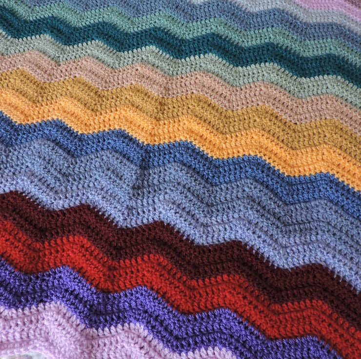 I've crocheted this colourful zig zag blanket from 100% premium acrylic double knit yarns in a variety of colours .Red, yellow, green, blue, pink and mauve. A soft and warm blanket. Ideal as a pram blanket, crib blanket, pet blanket. Cool wash recommended and dry naturally or use a cool setting on a tumble dryer. An eco blanket that has been made with all the small left over balls of yarn.